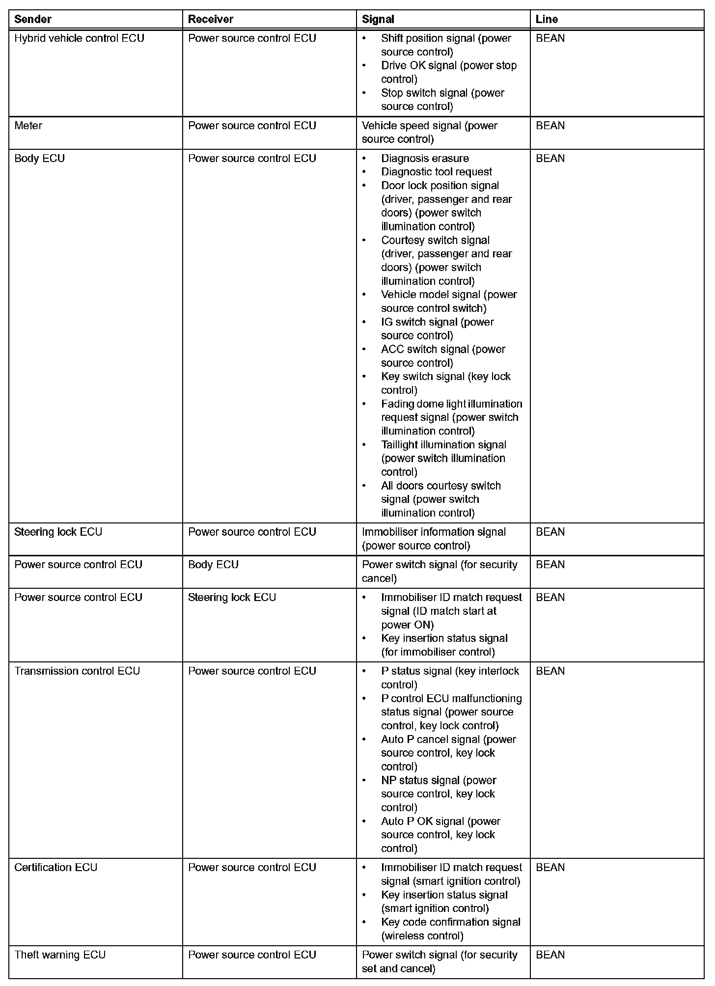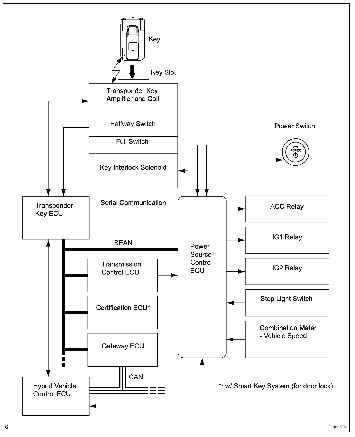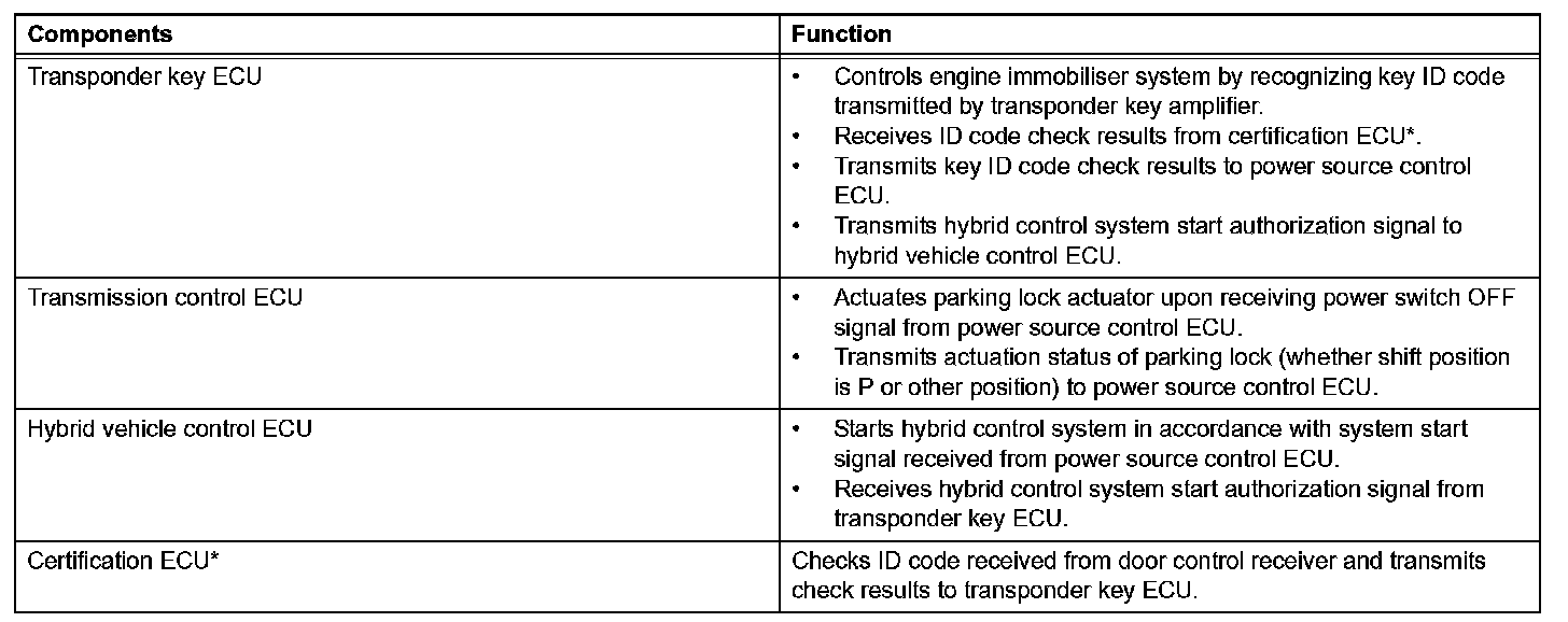 - When a key is inserted into the key slot and the transponder key ECU recognizes the ID code of the key, the power source control ECU authorizes operation of the power switch.