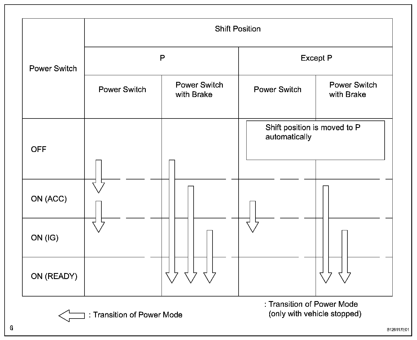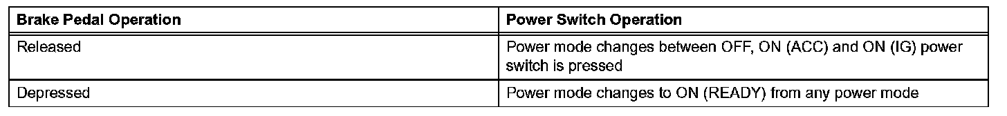 - A power mode (OFF, ON (ACC) and ON (IG)) can be selected by pressing the power switch. Press, release and press the power switch until the desired power mode is selected (the power mode cycle in the order shown above). If the driver pushes the power switch while depressing the brake pedal (the stop light switch turns ON), the power mode will change to ON (READY) regardless of the previous power mode.