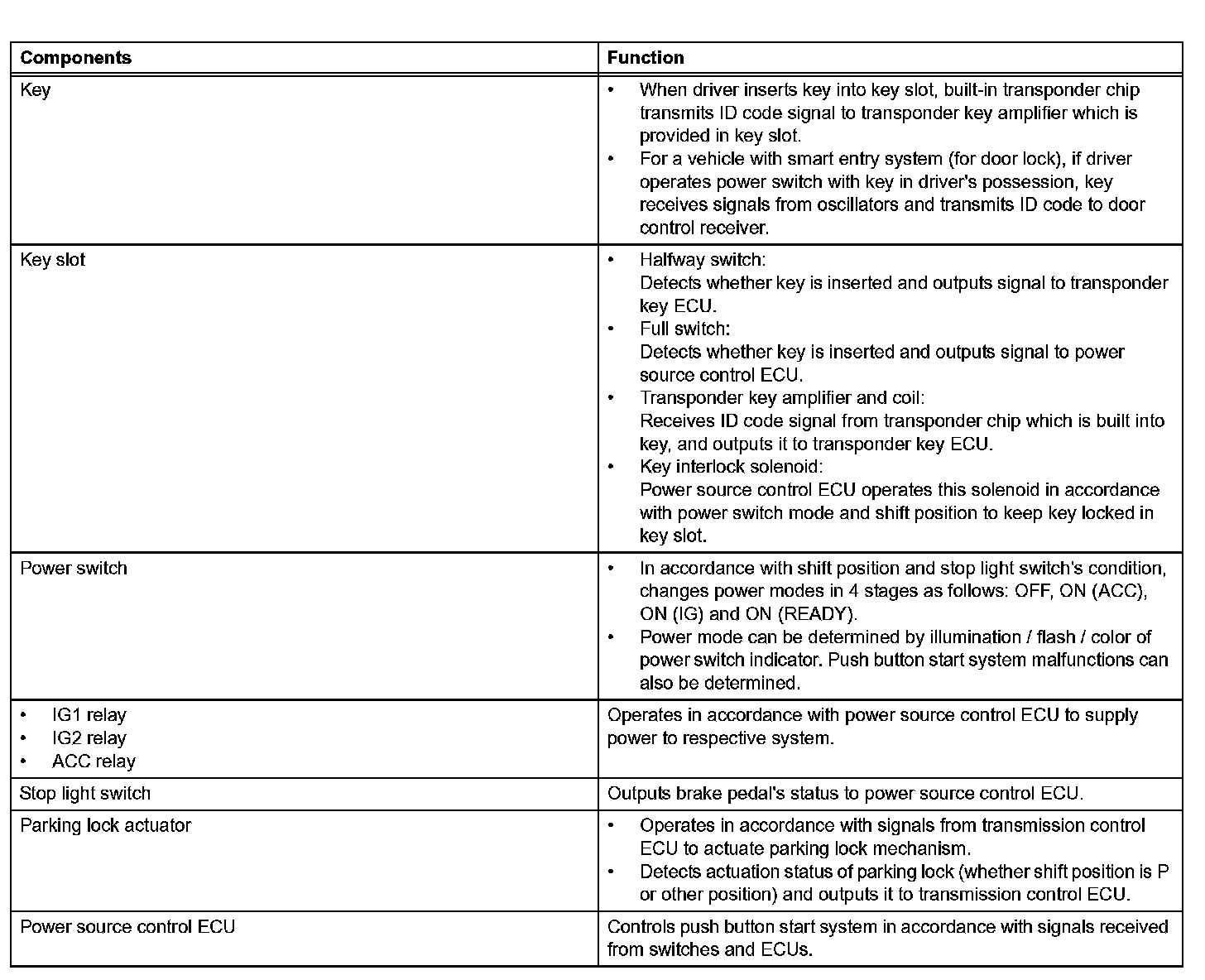 a. The smart key system uses a push-type power switch, which the driver operates by inserting a key into the key slot or by merely carrying the key*. This system consists of a power source control ECU, power switch, key slot, key, ACC relay, IG1 relay, IG2 relay and transponder key ECU. The power source control ECU controls the system. This system operates in conjunction with the engine immobilizer system and the smart key system*. The table below shows the transition of the power switch, which depends on whether the brake pedal is depressed or released.