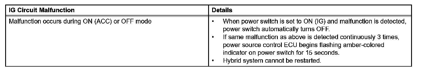 If a malfunction occurs in the IG circuit, the power source control ECU will perform the controls listed in the table and record a DTC.
