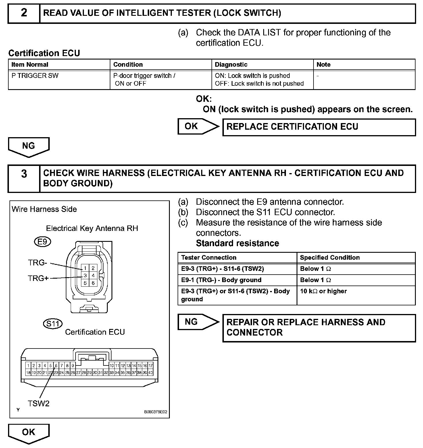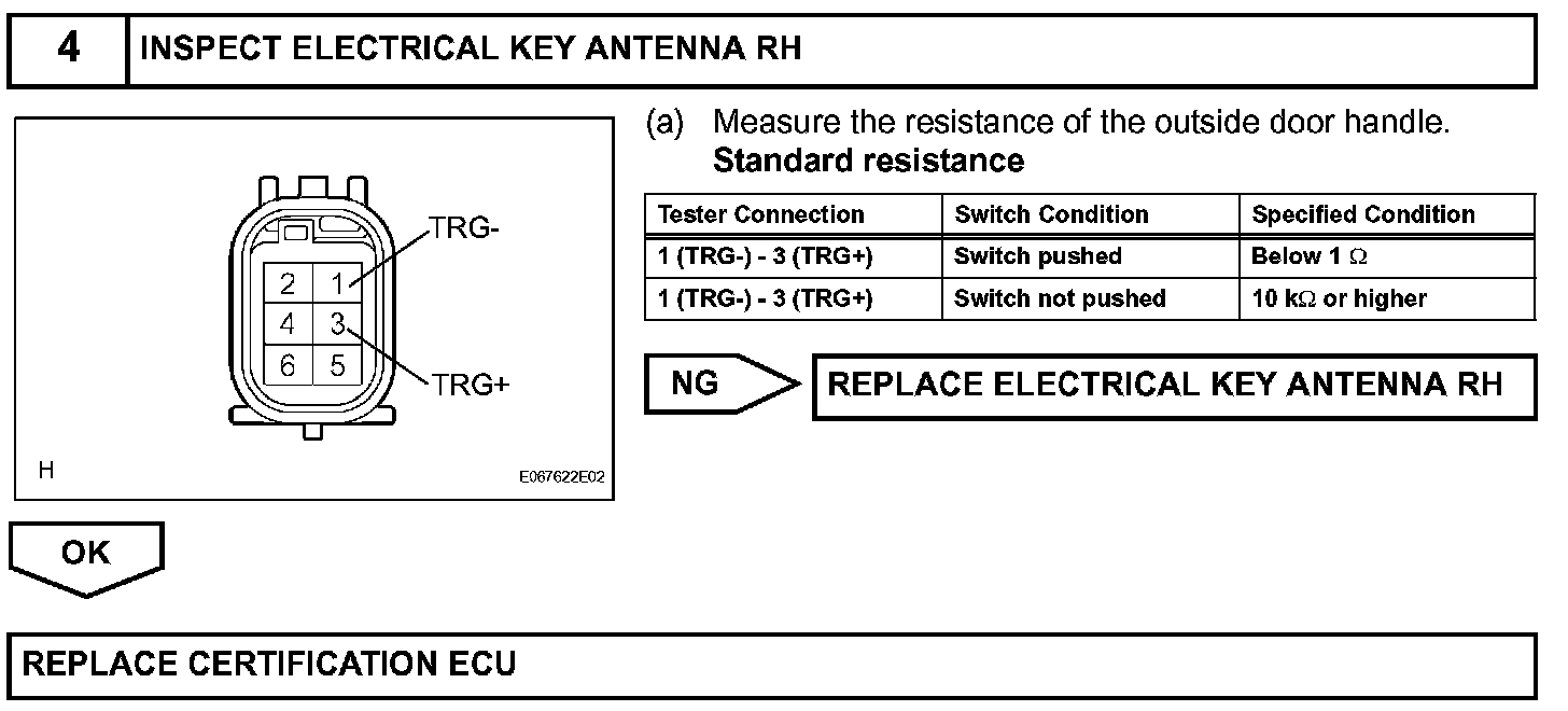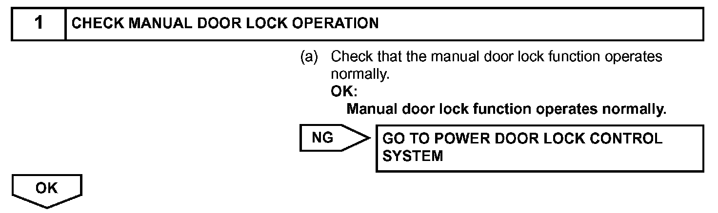 When the touch sensor inside the outside door handle RH is touched, the certification ECU sends a request signal to the door electrical key oscillator. The key receives this request and transmits its ID code. Upon receiving the ID code, the certification ECU determines that the key is outside the vehicle and sends a lock signal to the passenger door lock through the instrument panel junction block (multiplex network body ECU).