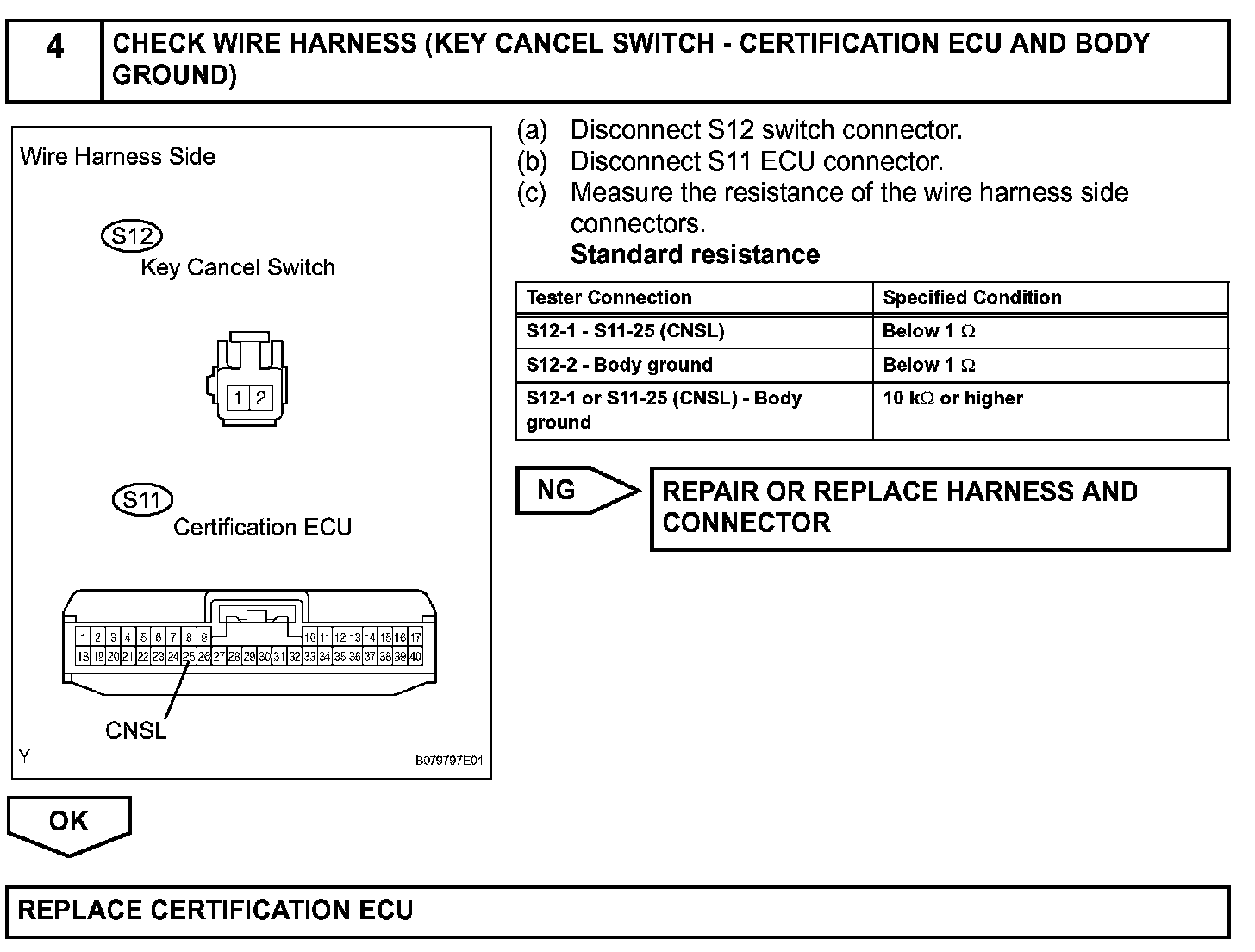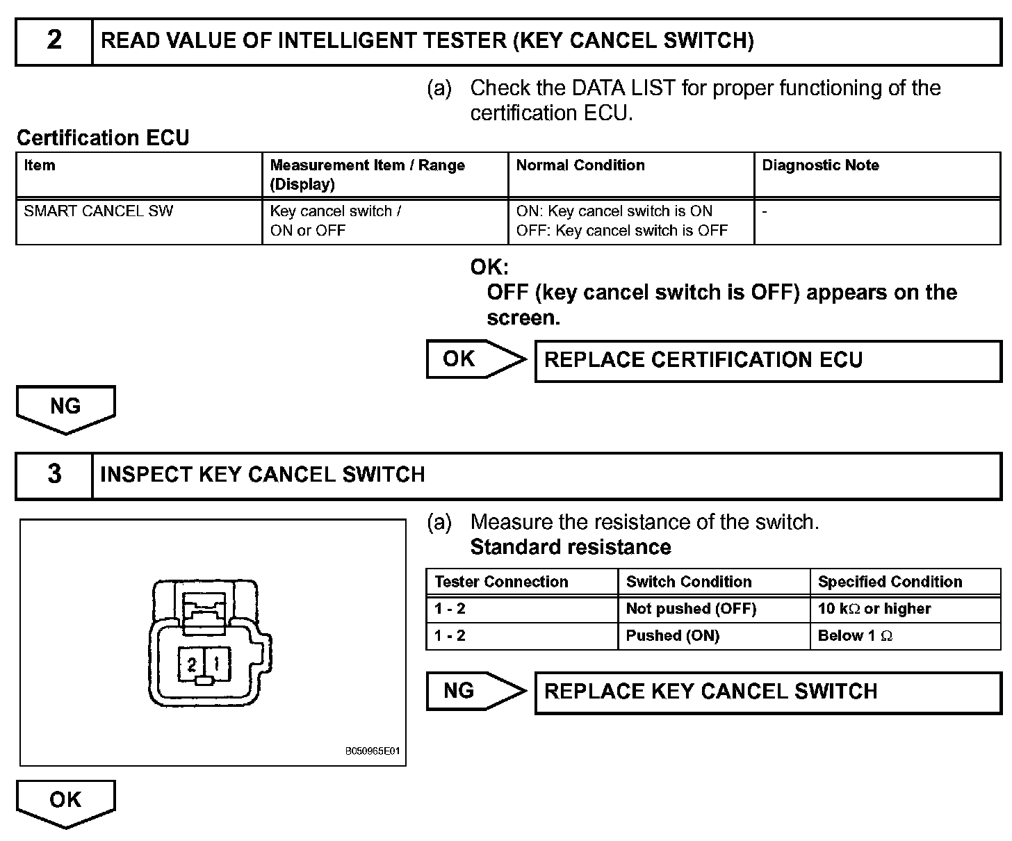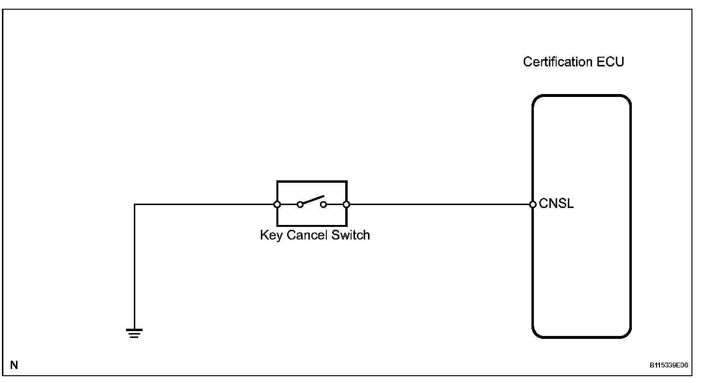 When the key cancel switch is ON, all entry functions will stop operating. If the key cancel switch is not turned ON but all entry functions stop operating, one of the following is malfunctioning: 1) key cancel switch, 2) certification ECU, or 3) wire harness.