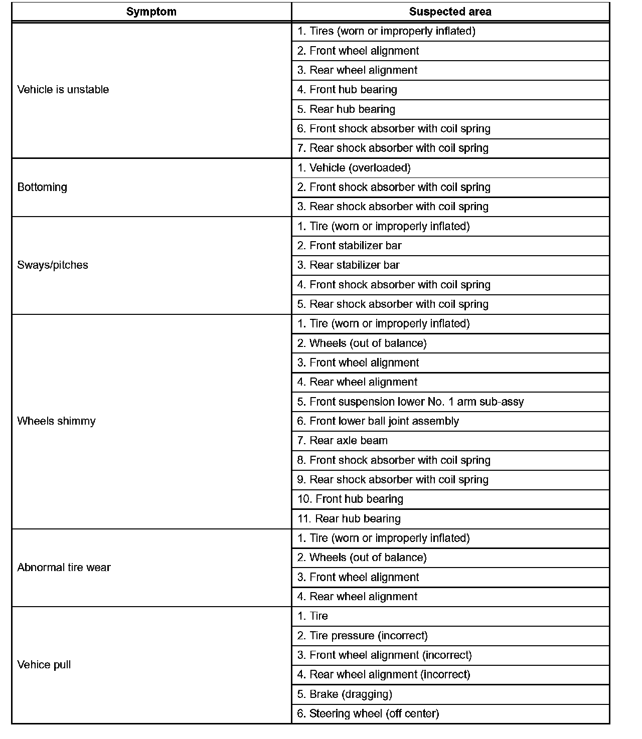 SUSPENSION SYSTEMPROBLEM SYMPTOMS TABLE