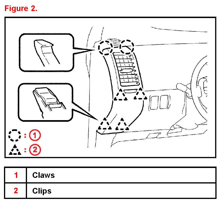 Detach the 2 claws and 4 clips and remove the instrument panel register.