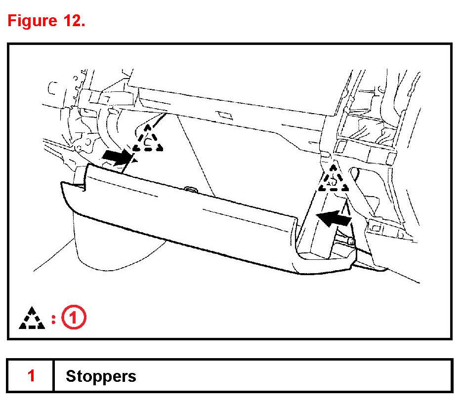 A. While pushing in the sides of the glove compartment door as indicated by the arrows open the door to release it from the 2 stoppers.