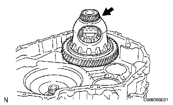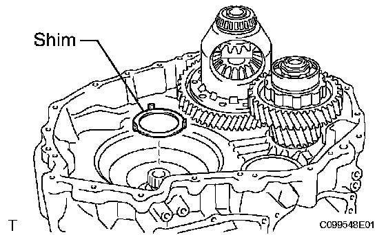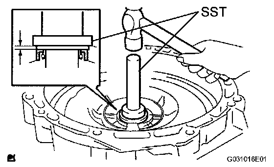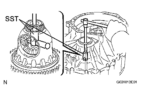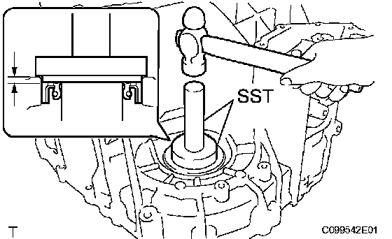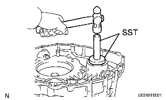 2 Using SST, tap in the differential case tapered roller bearing LH outer race and shim to the motor.