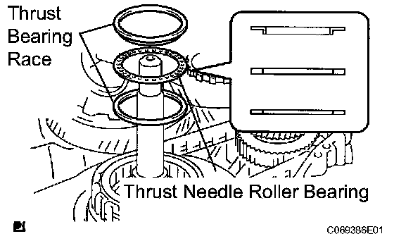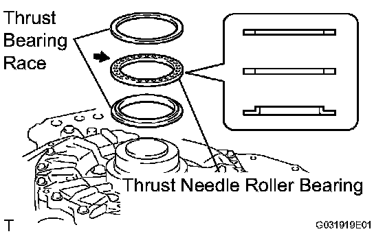 1 Apply ATF WS to the sliding surfaces of the thrust needle roller bearing and install the bearing.