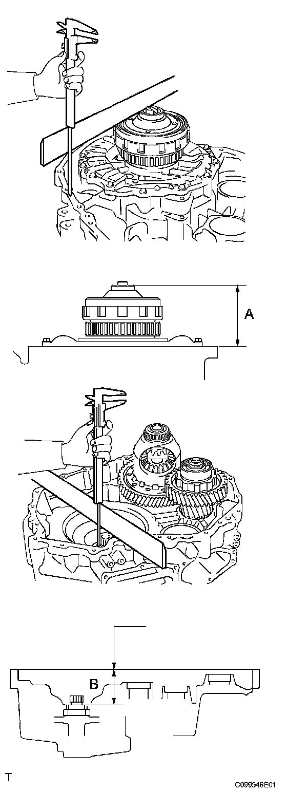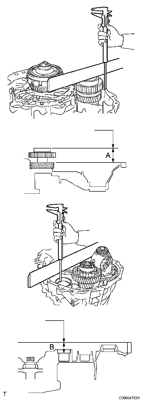 Standard value: Select shim = (Dimension B - Dimension A) - 0.1 mm (0.0039 inch) to 0.4 mm (0.0157 inch)