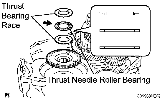 1 Apply ATF WS to the sliding surfaces of the thrust needle roller bearing and install the flange.