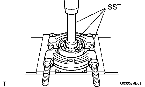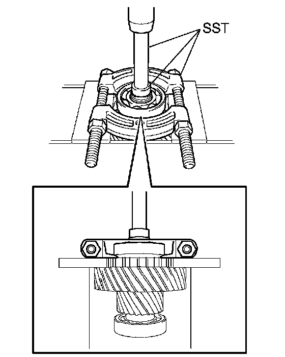 c. Using SST and a press, press out the bearing from the differential driver pinion.