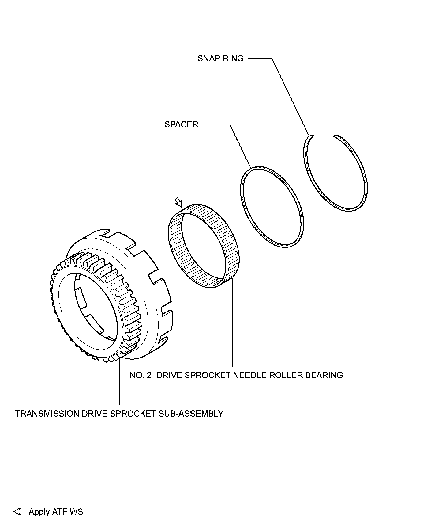 a. Apply ATF WS to the sliding surfaces of the bearing and install the needle roller bearing to the transmission drive sprocket.