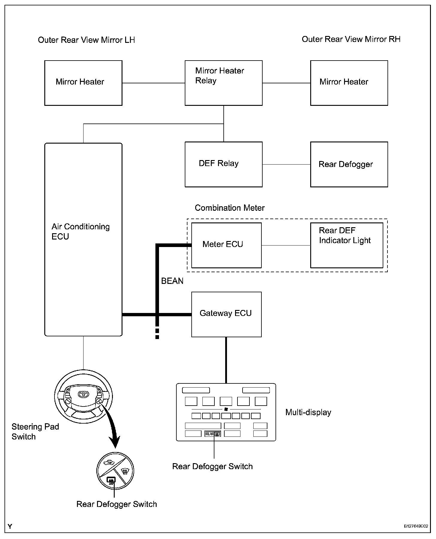 The defogger system uses the heater wire in the rear windshield glass to defog the rear windshield glass. The circuit of this system is shared with the outside rear view mirror heater system, which operates in the same manner.