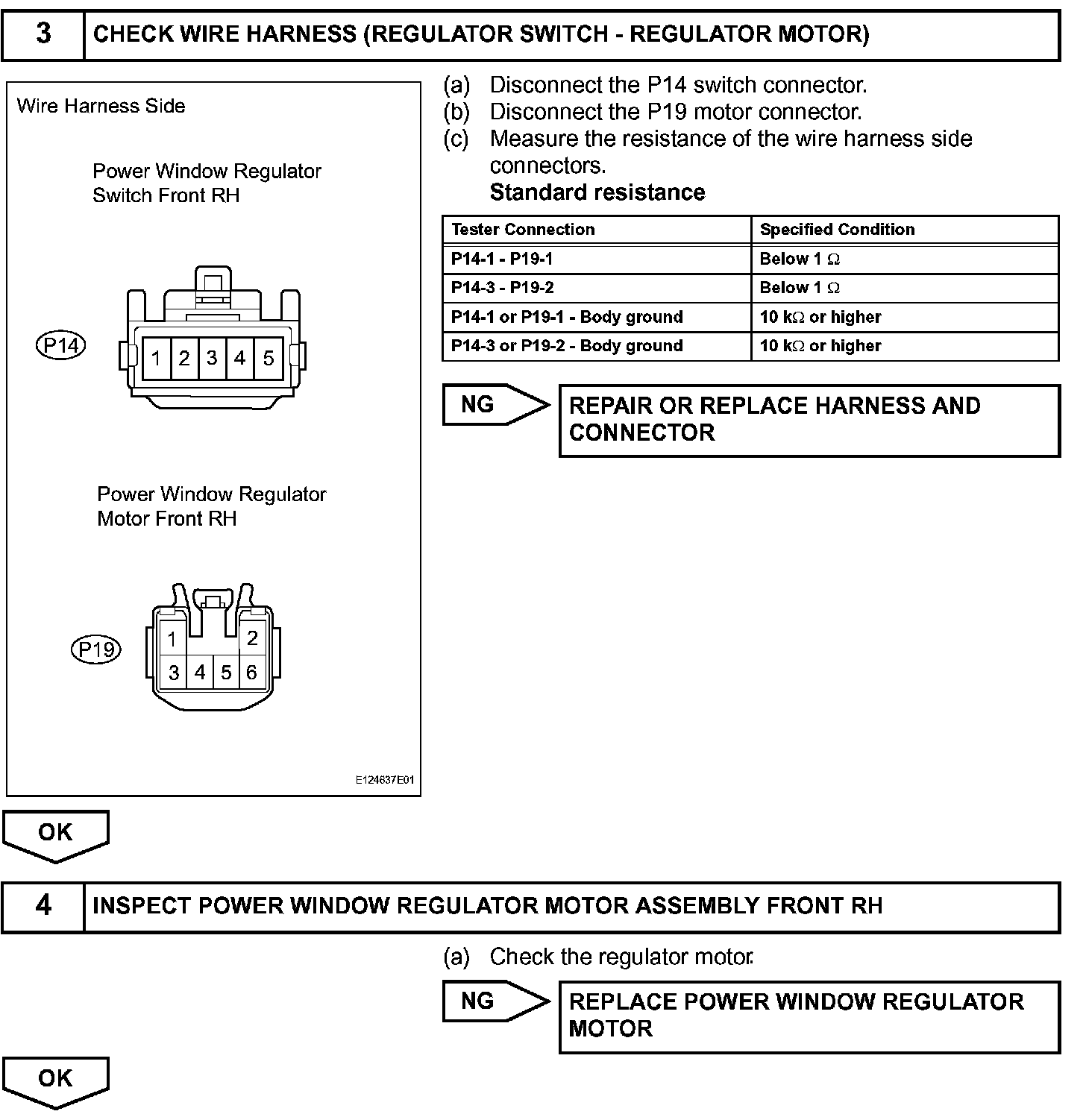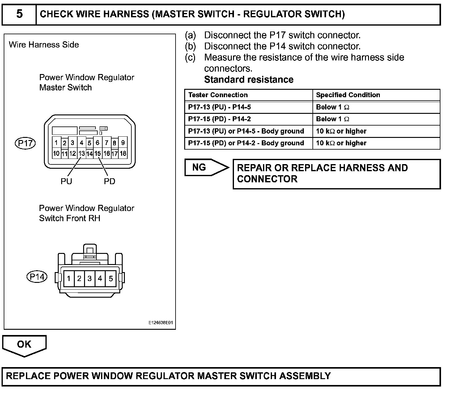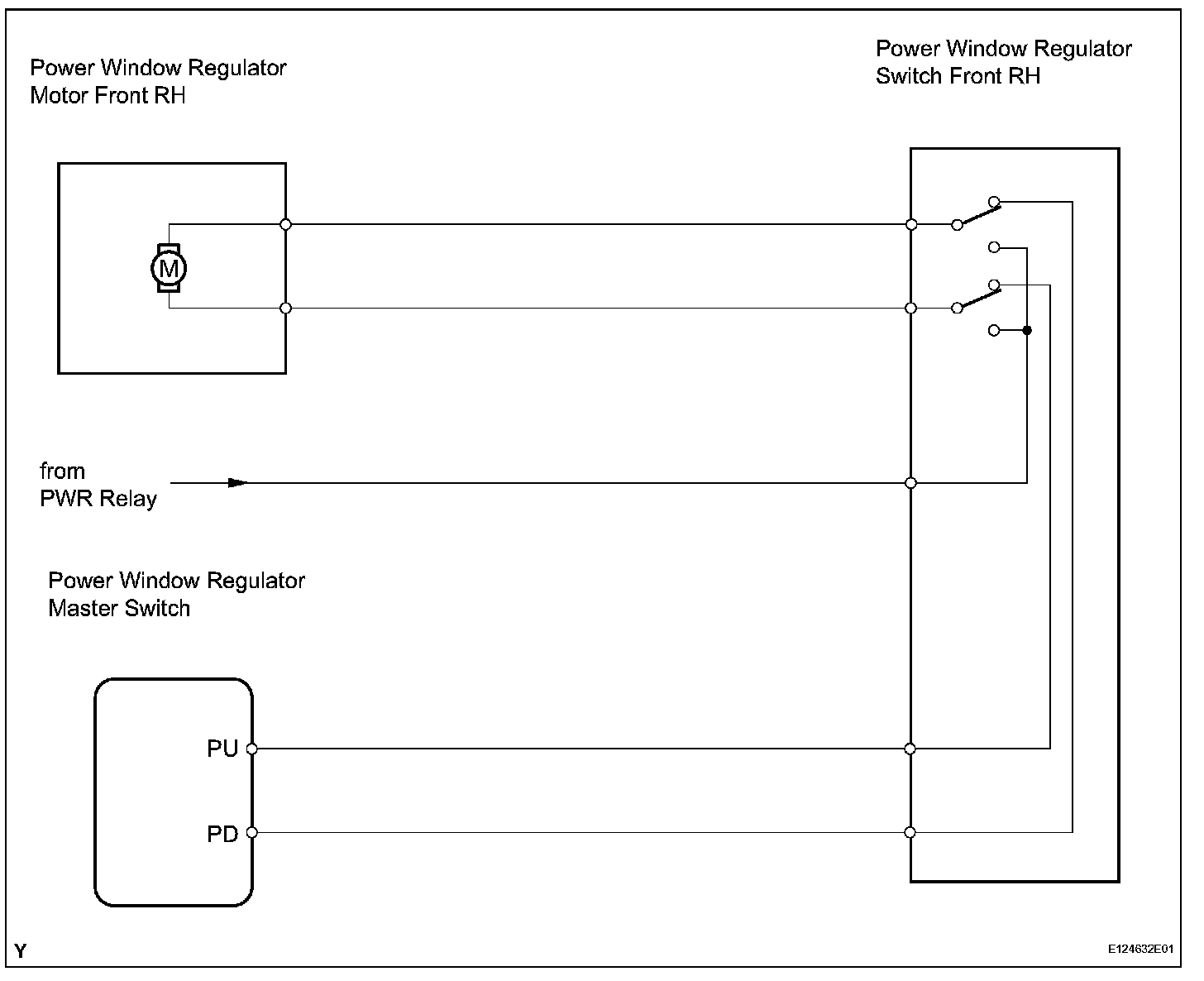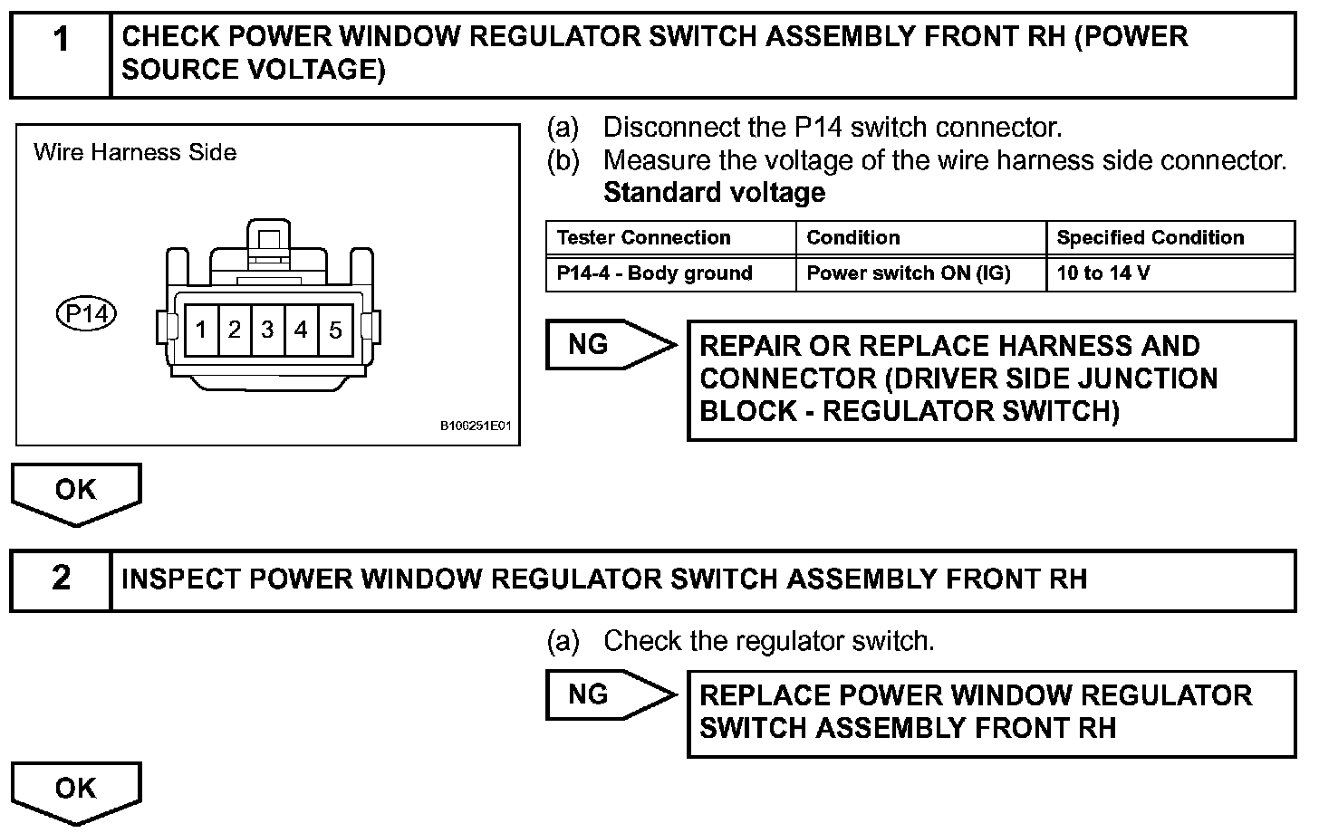 If the passenger side manual UP / DOWN function does not operate, a malfunction may be present in the power window regulator motor, power window regulator switch, power window regulator master switch or wire harness.