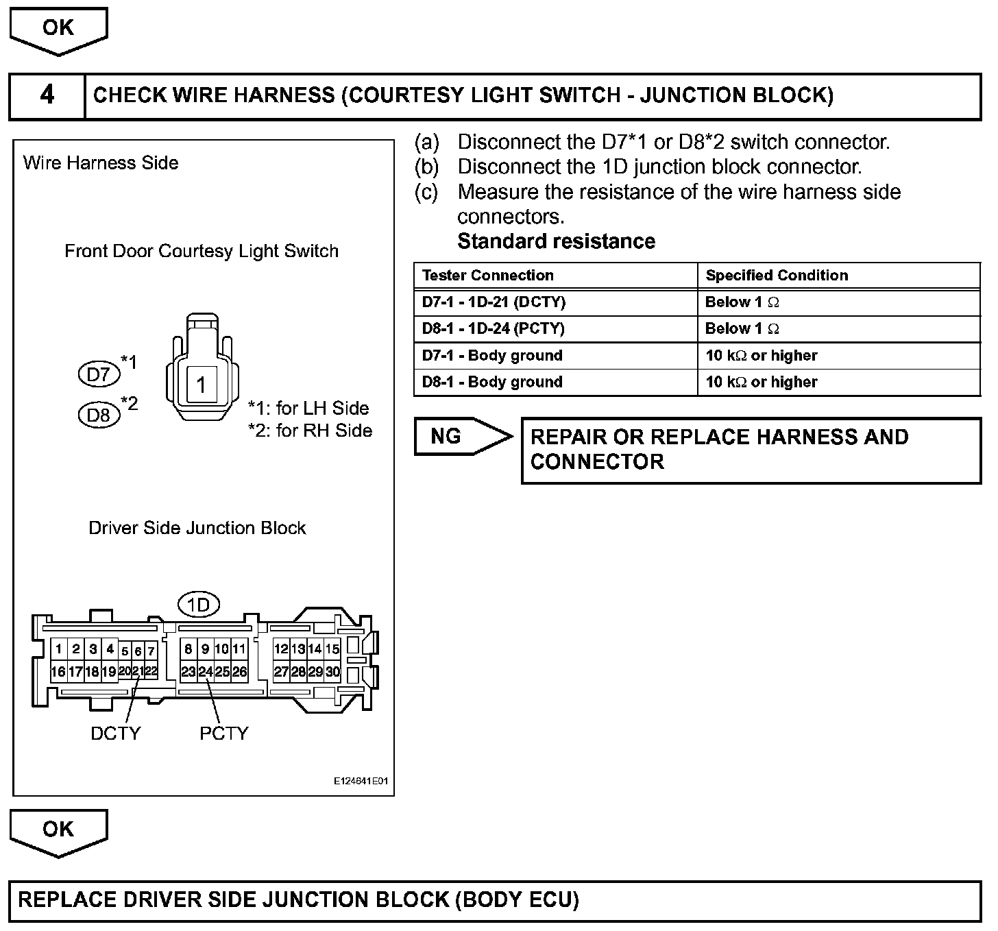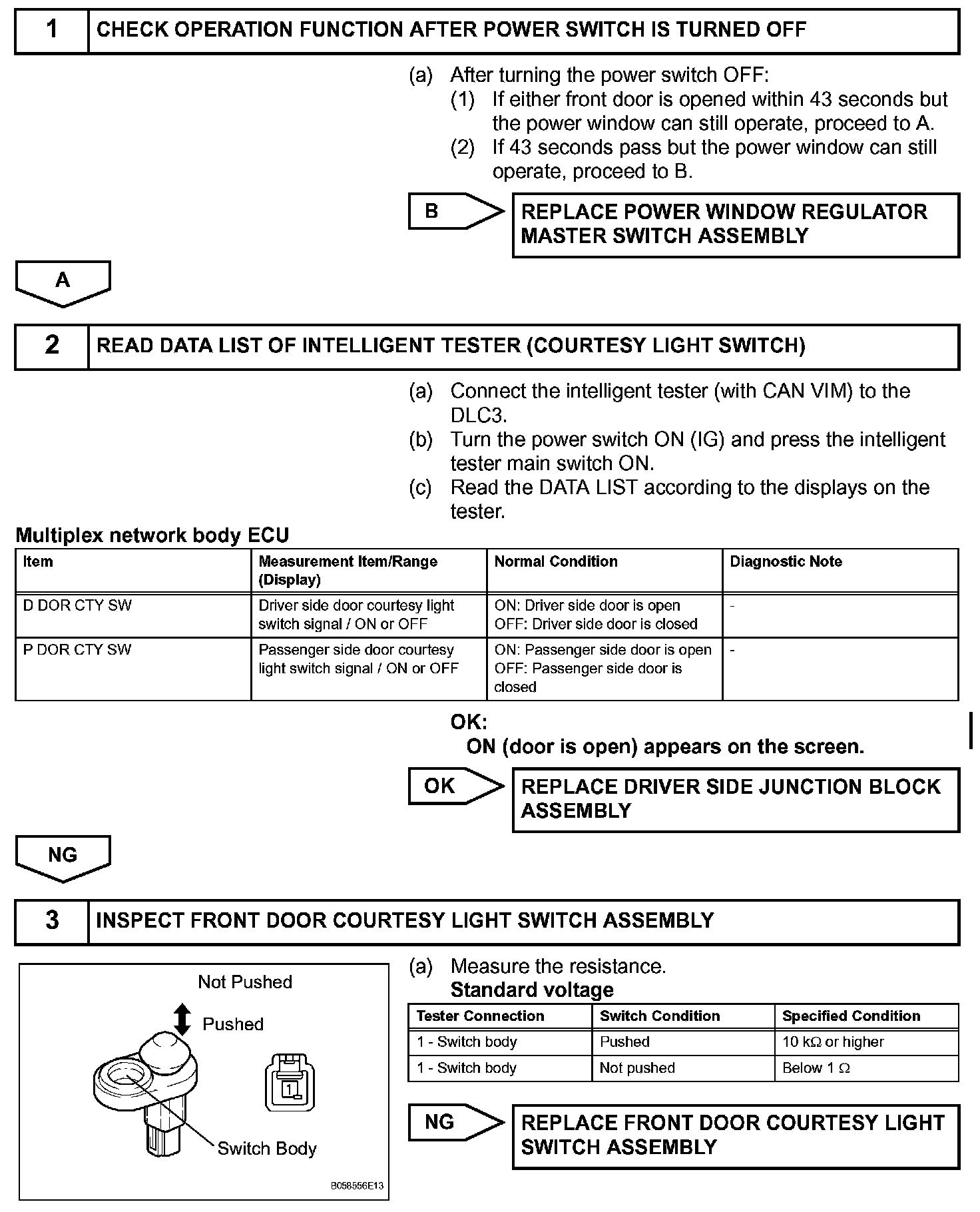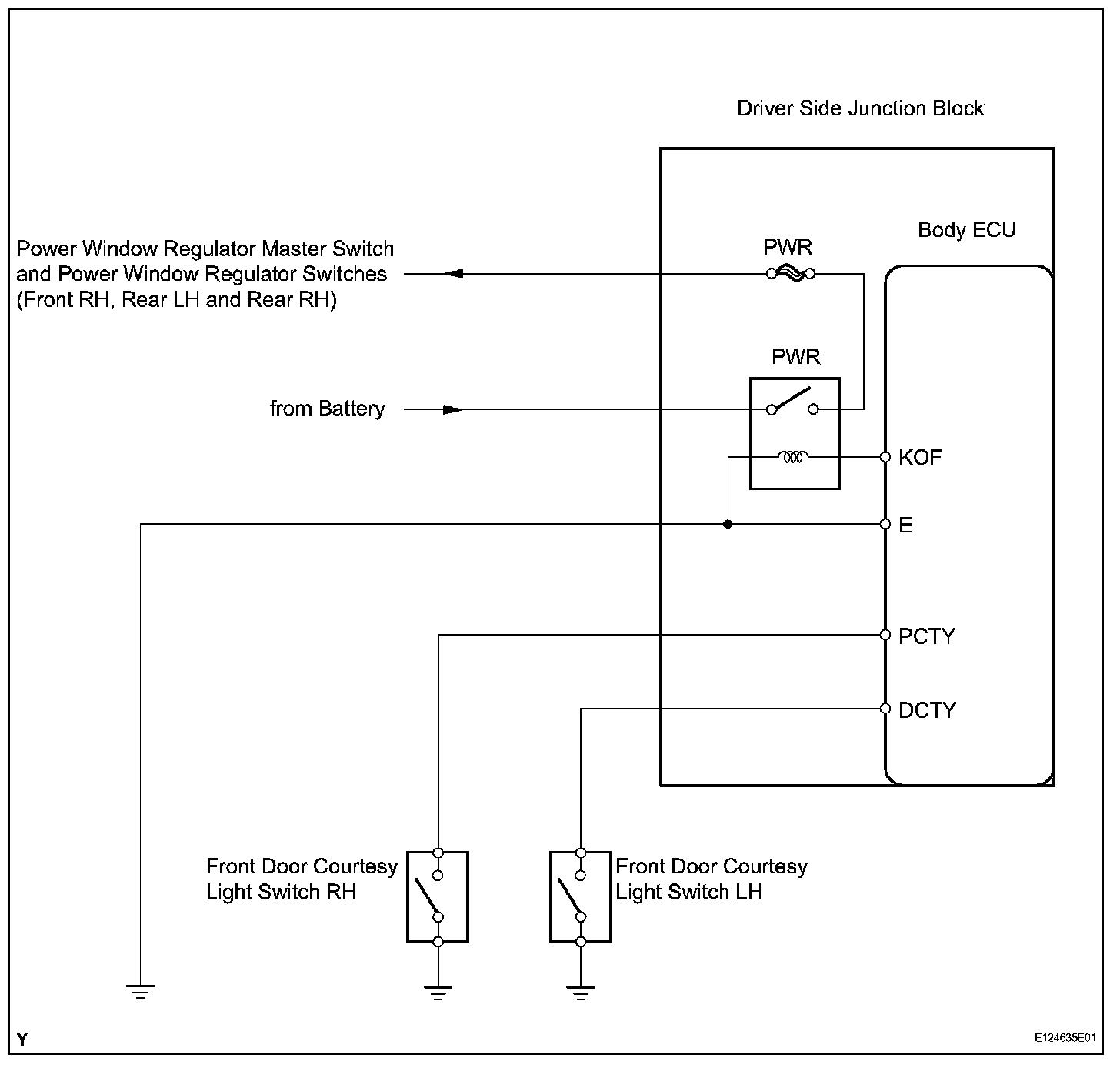The body ECU keeps power supplied to the power window regulator master switch and the regulator switch for 43 seconds after the power switch is turned OFF. However, the body ECU will cut power to the master switch if: 1) either front door is opened, 2) a signal from either of the front door courtesy light switches is input to the ECU within the 43 seconds, or 3) 43 seconds have passed.