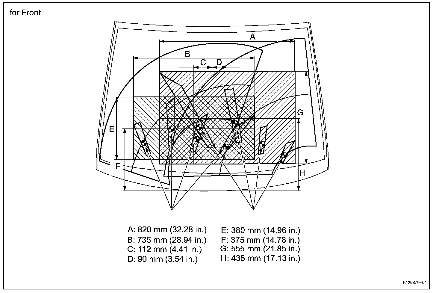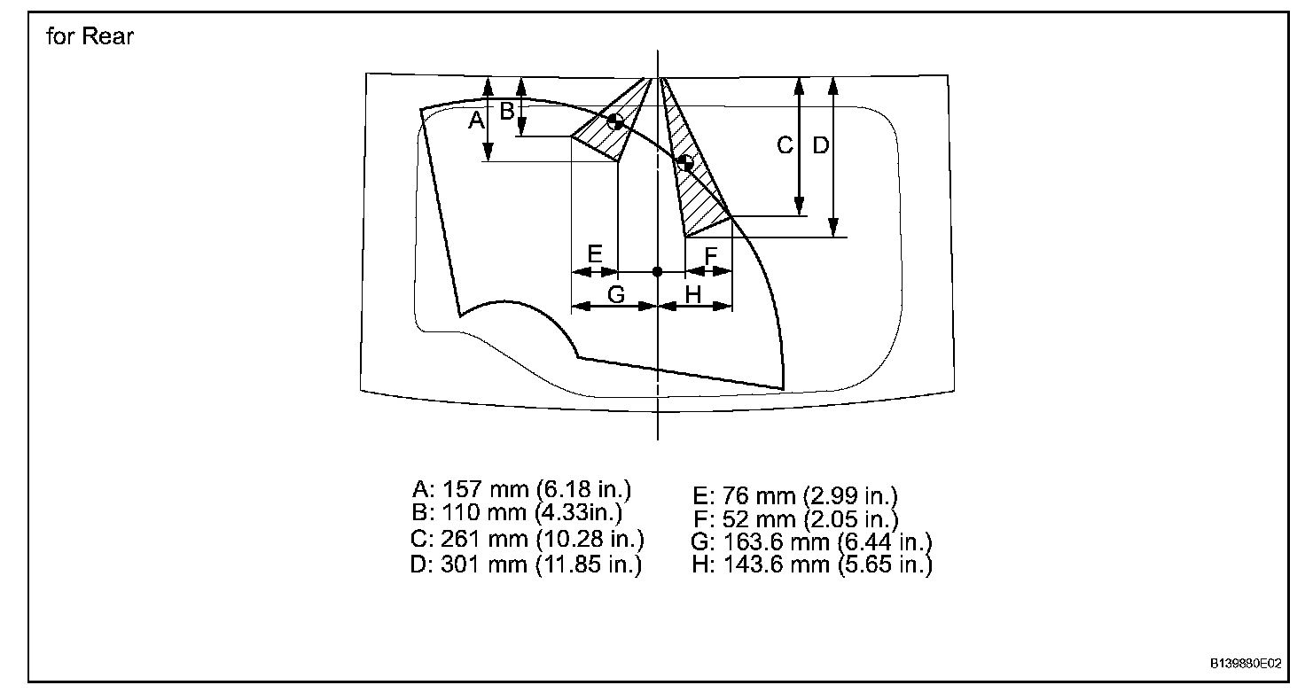 Standard: Washer fluid hits the windshield in the areas indicated in the illustration.