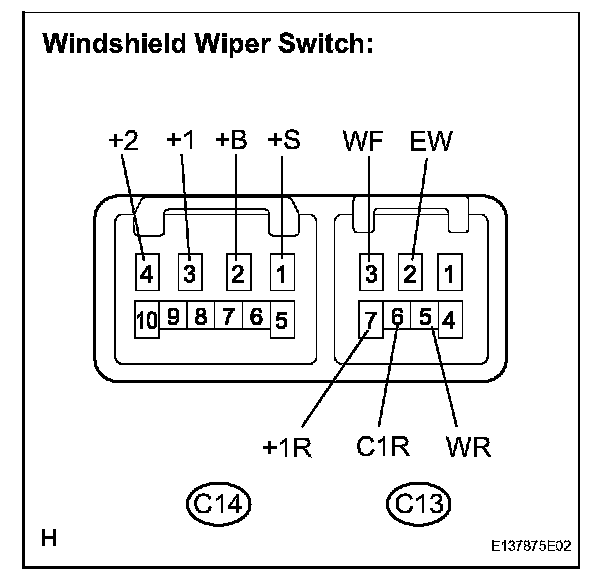 5. Connect the negative battery (-) lead to terminal C14-1 (+S) of the connector. Operate the intermittent wiper relay and measure the voltage between terminals C14-3 (+1) and C13-2 (EW)