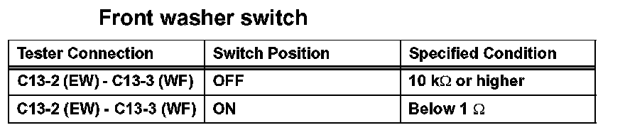 4. Turn the washer switch to the ON and OFF positions, and measure the voltage between terminals C14-3 (+1) and C13-2 (EW).
