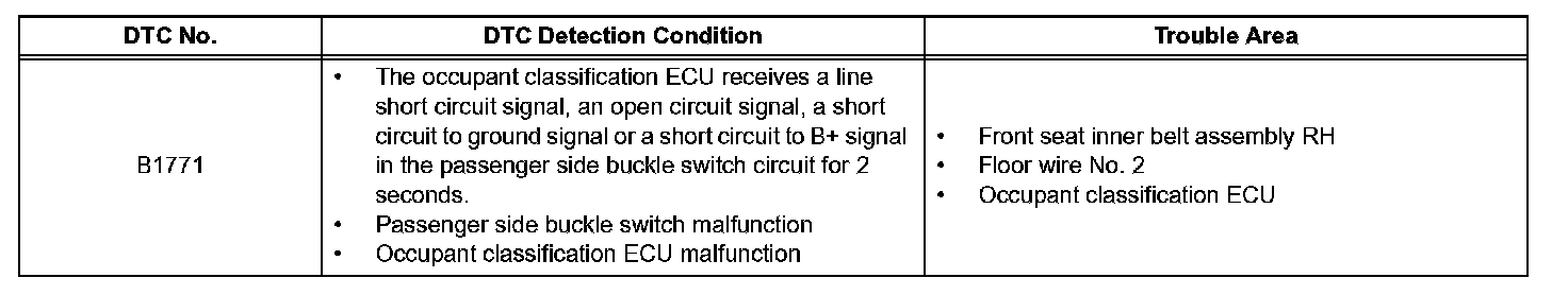 DTC B1771 is recorded when a malfunction is detected in the passenger side buckle switch circuit.