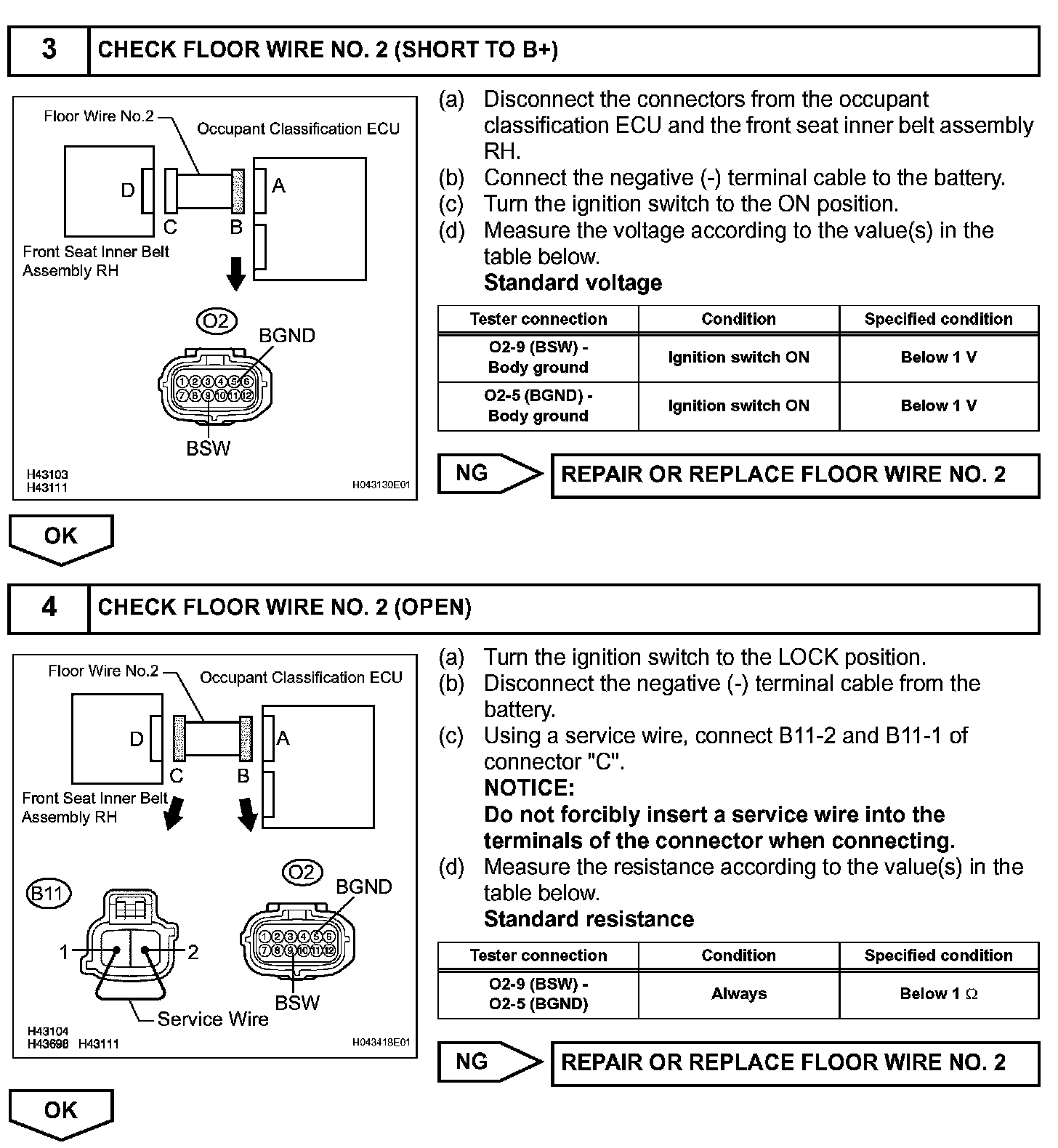 - If troubleshooting (wire harness inspection) is difficult to perform, remove the front passenger seat installation bolts to see the under surface of seat cushion.