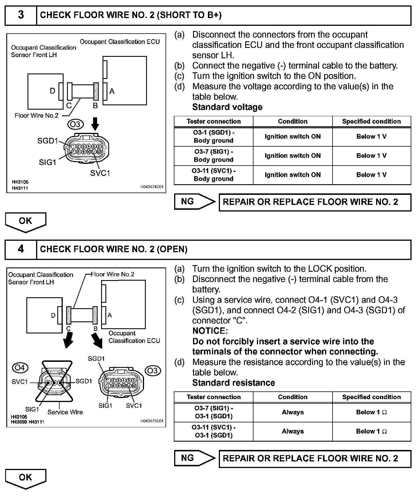 - If troubleshooting (wire harness inspection) is difficult to perform, remove the front passenger seat installation bolts to see the under surface of seat cushion.