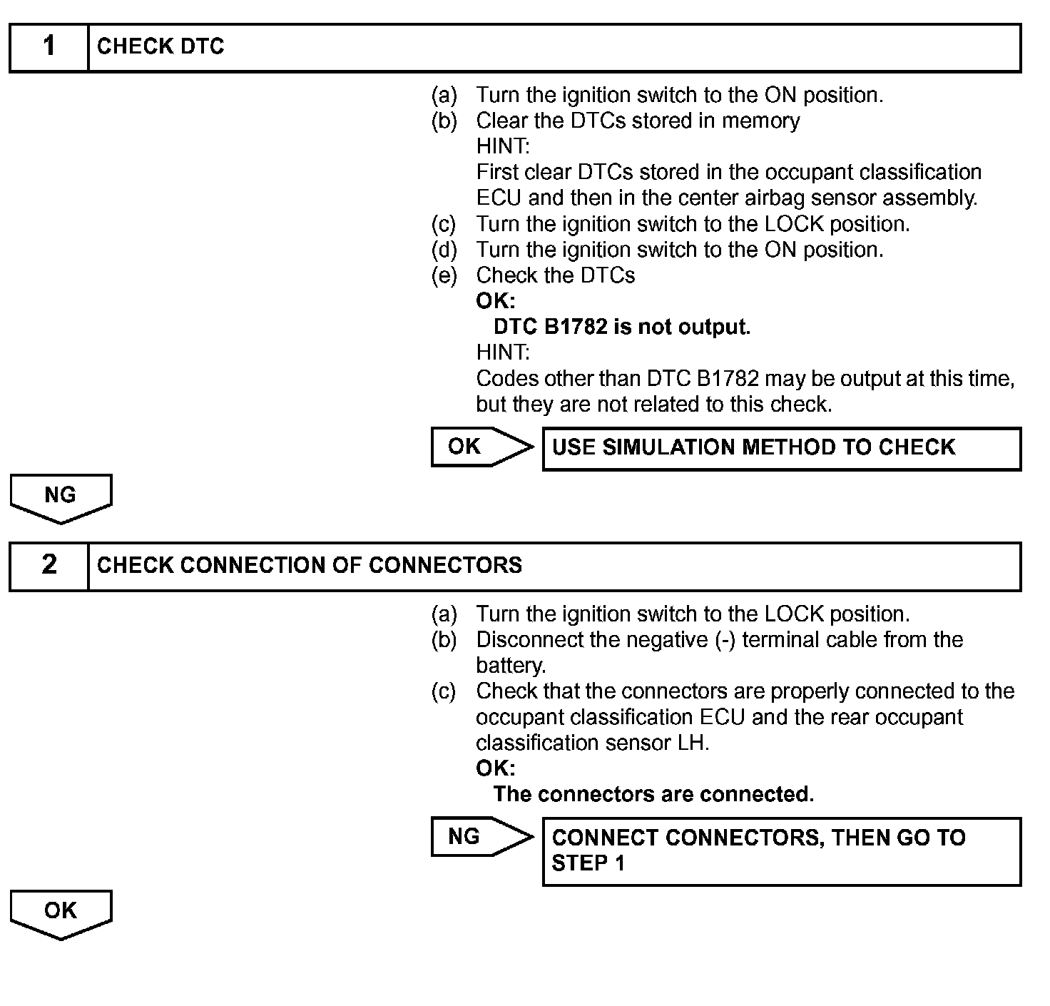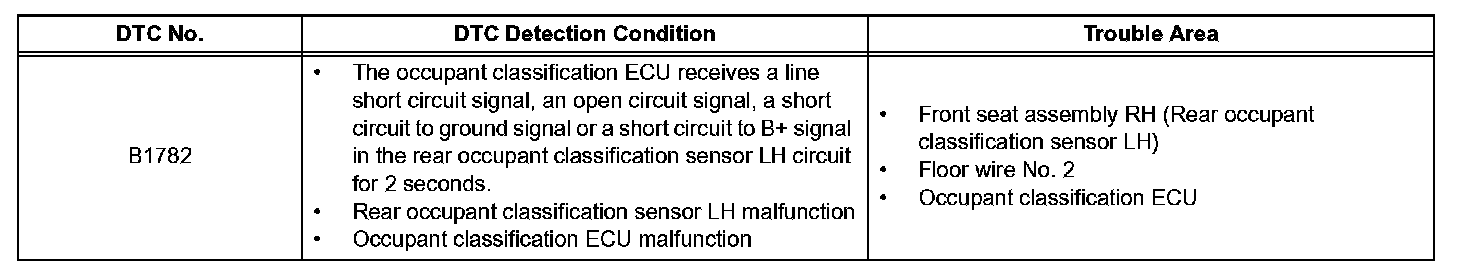 DTC B1782 is recorded when a malfunction is detected in the rear occupant classification sensor LH circuit.