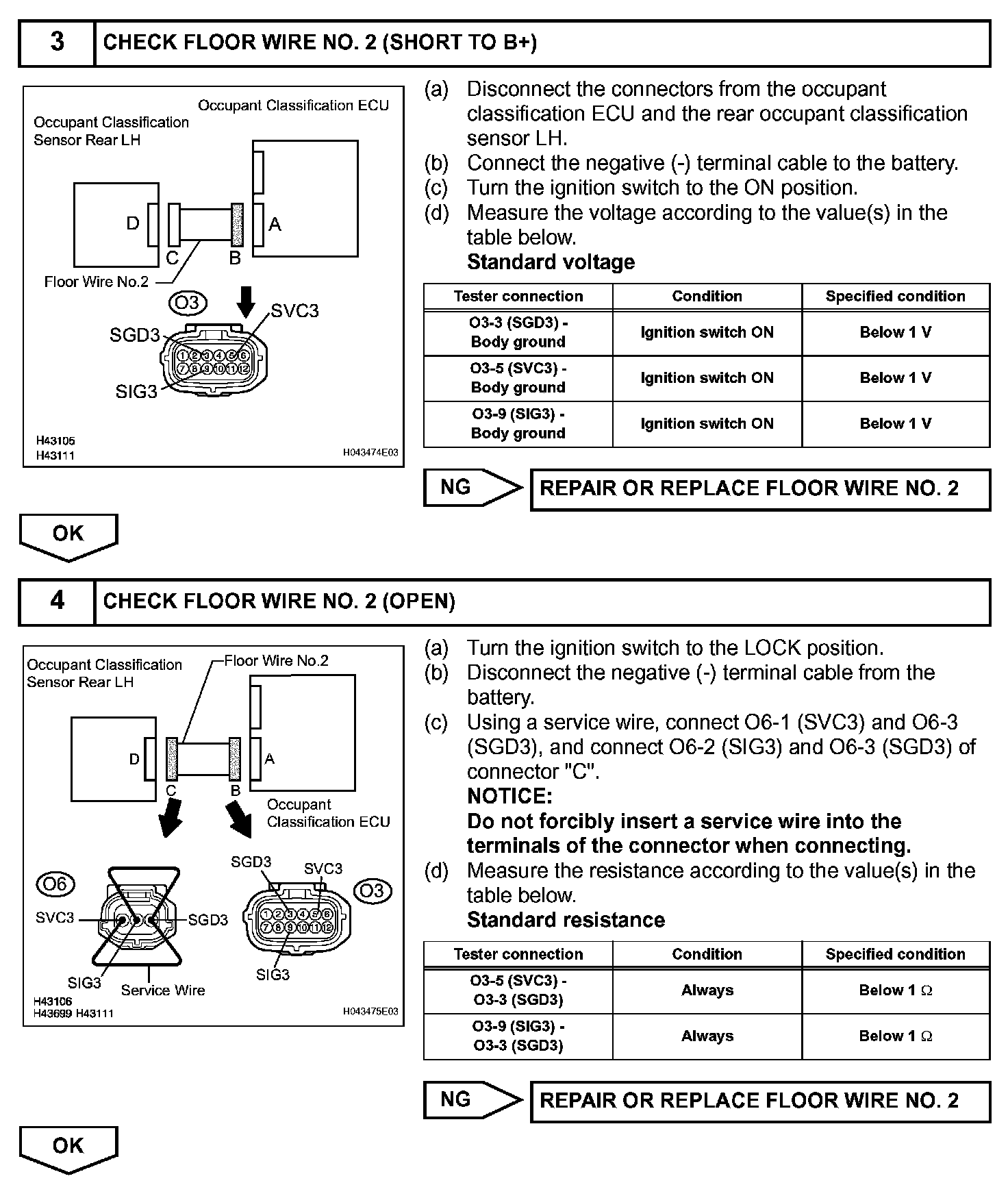 - If troubleshooting (wire harness inspection) is difficult to perform, remove the front passenger seat installation bolts to see the under surface of seat cushion.