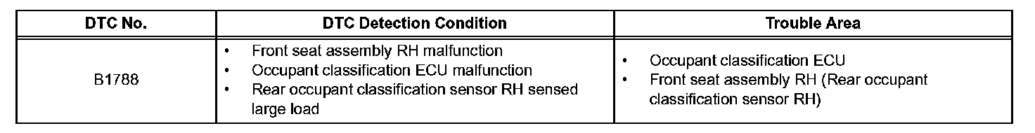 DTC B1788 is output when the occupant classification ECU receives a collision detection signal sent by the rear occupant classification sensor RH if an accident occurs.