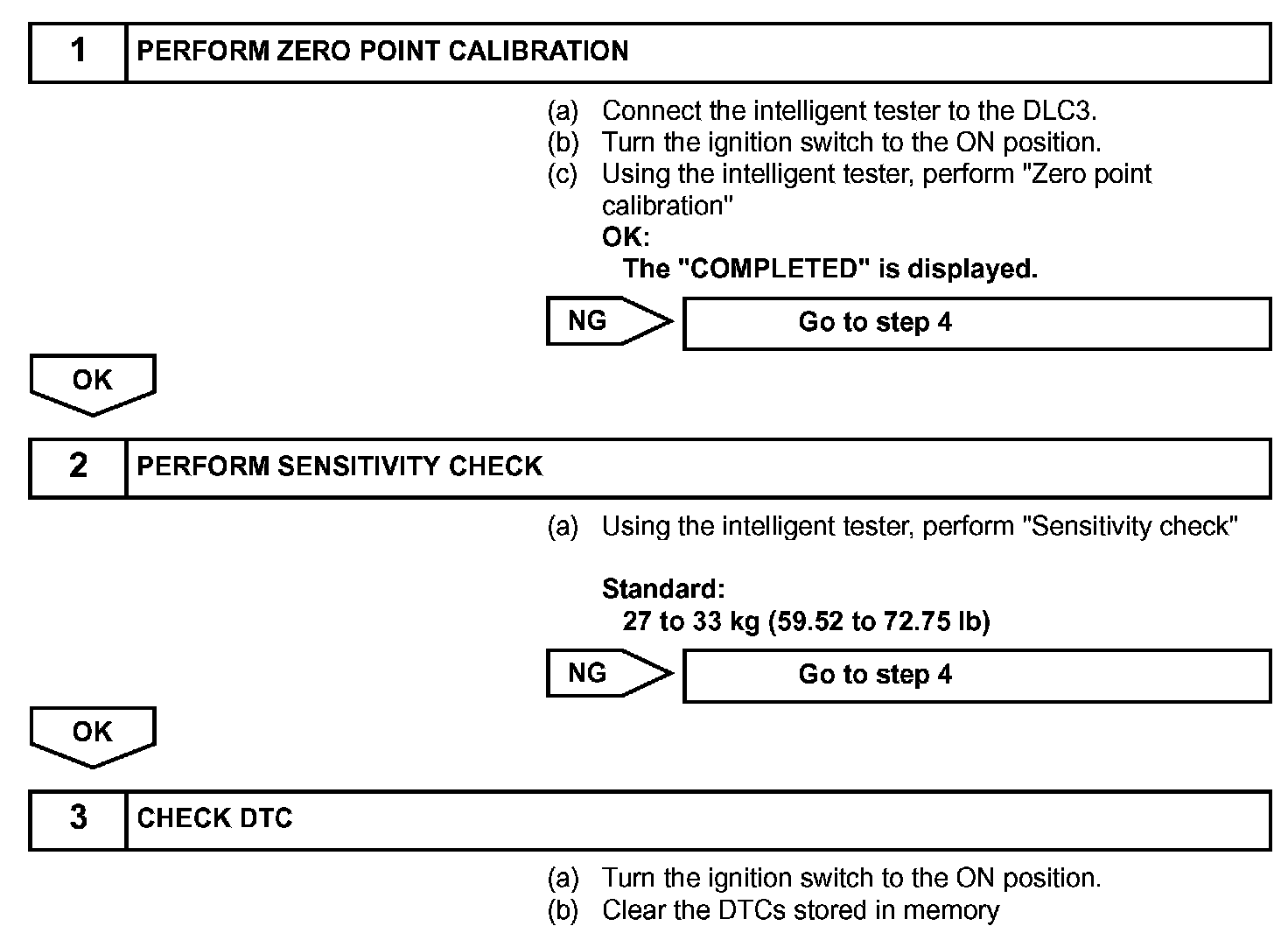 However, when the occupant classification ECU outputs a collision detection signal, even if the vehicle is not in a collision, DTC B1788 can be cleared by "Zero point calibration" and "Sensitivity check". Therefore, if DTC B1788 is output, first perform "Zero point calibration" and "Sensitivity check".
