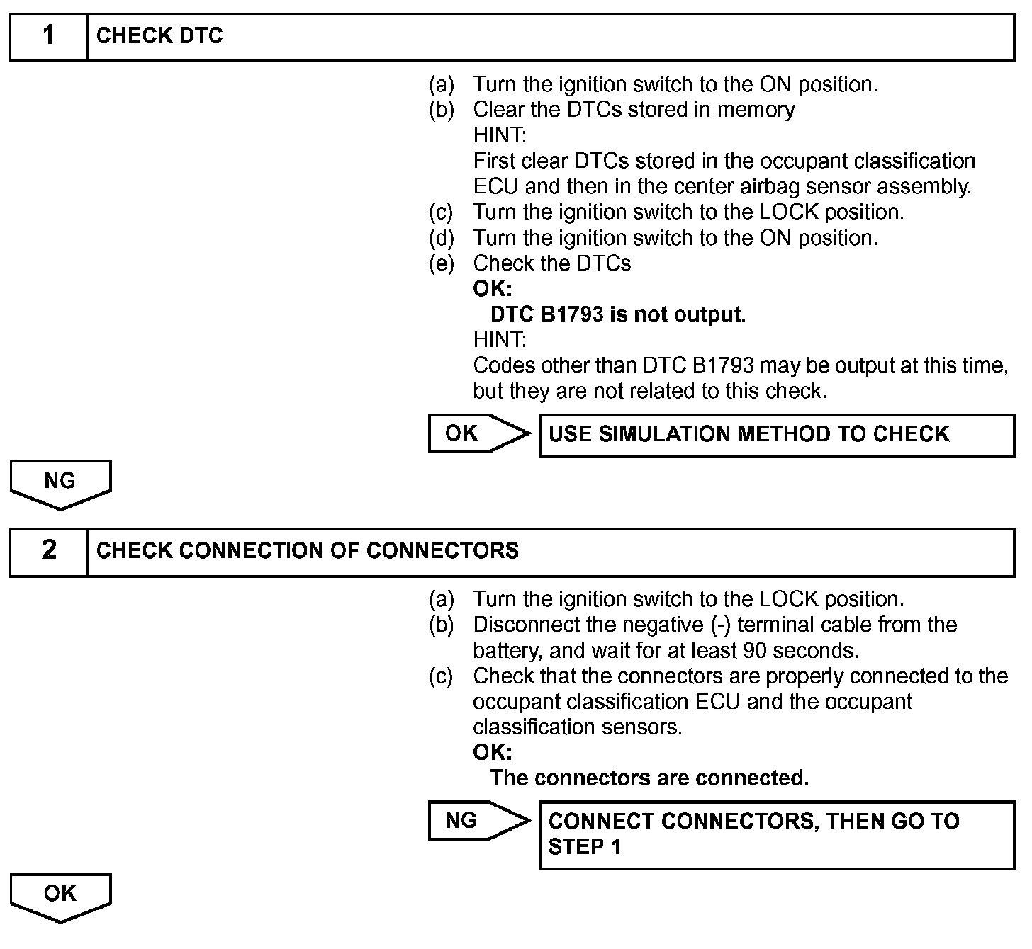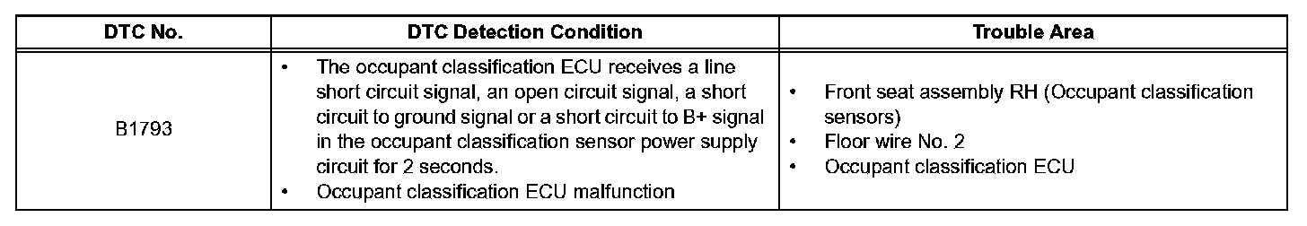 DTC B1793 is recorded when a malfunction is detected in the occupant classification sensor power supply circuit.