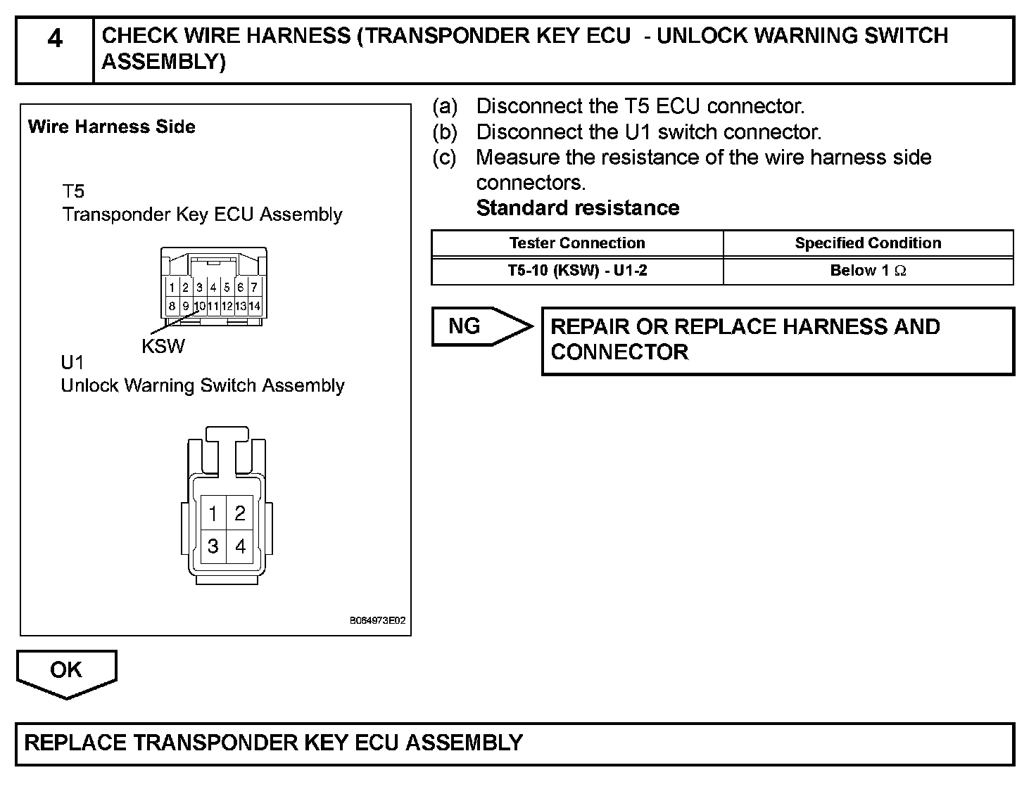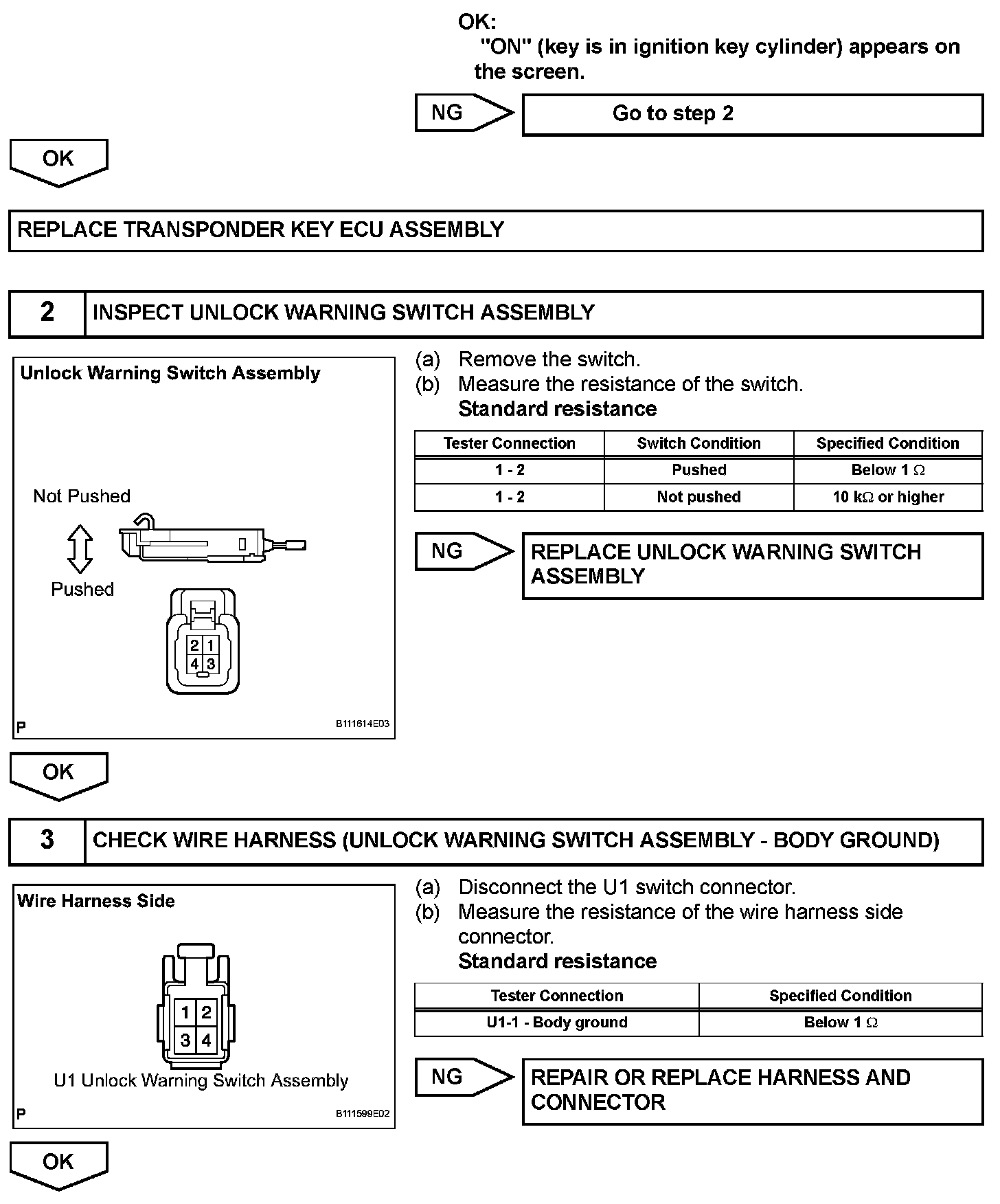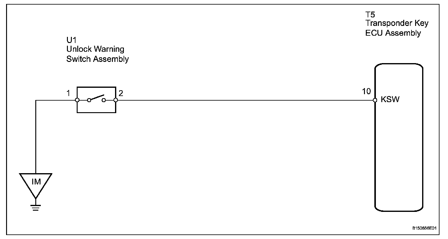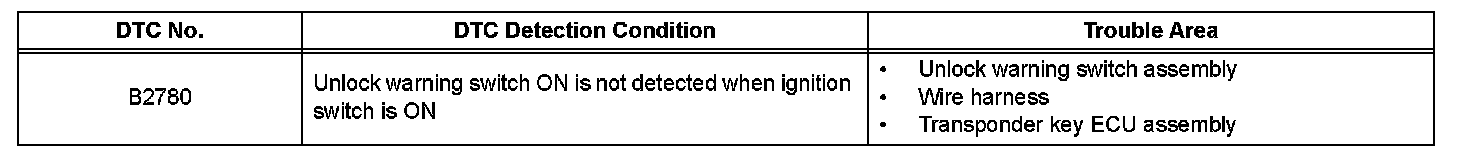 This DTC will be output if the transponder key ECU does not detect that the unlock warning switch is ON even when the ignition switch is ON. Under normal conditions, the unlock warning switch is ON when the ignition switch is ON.