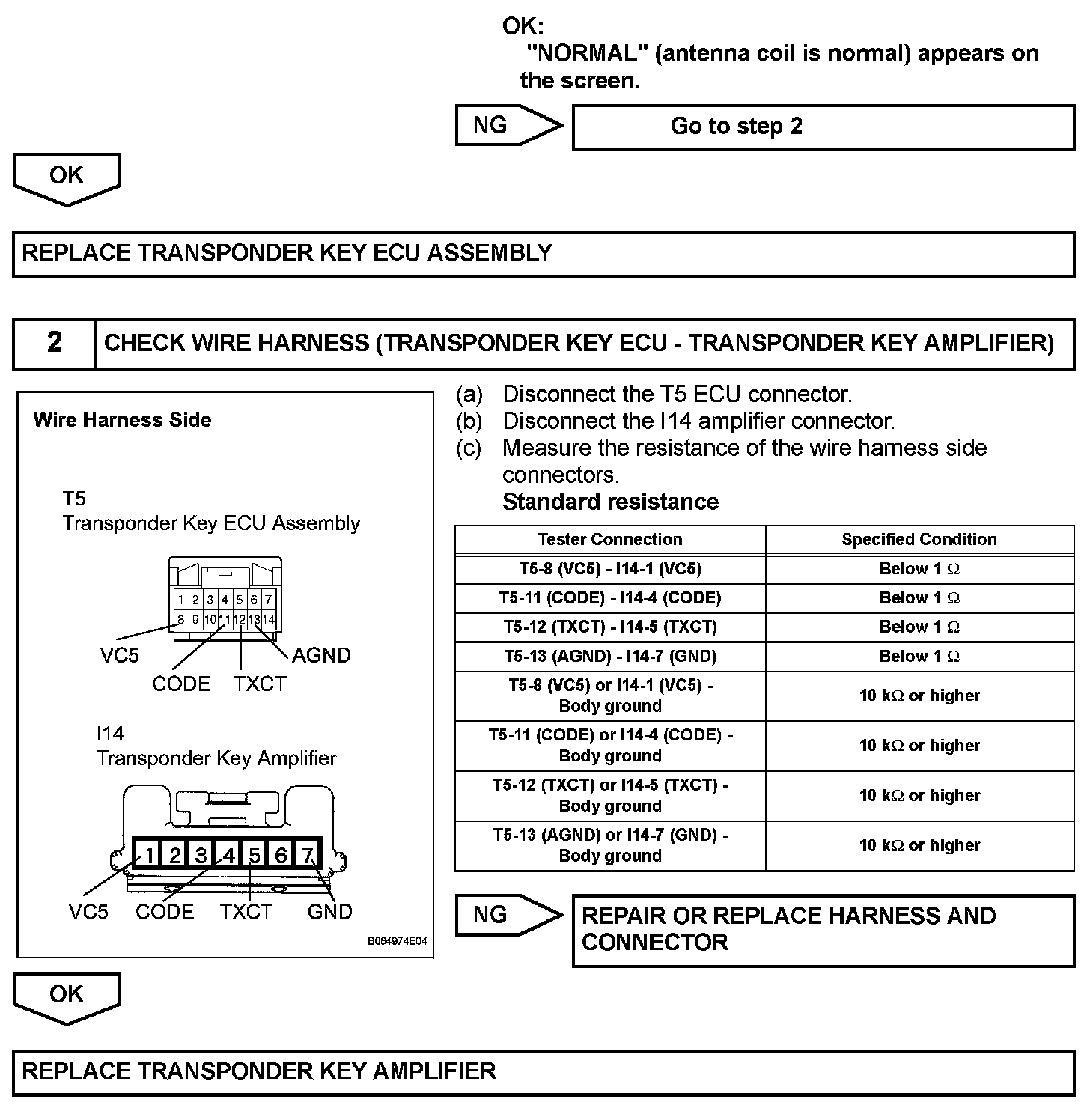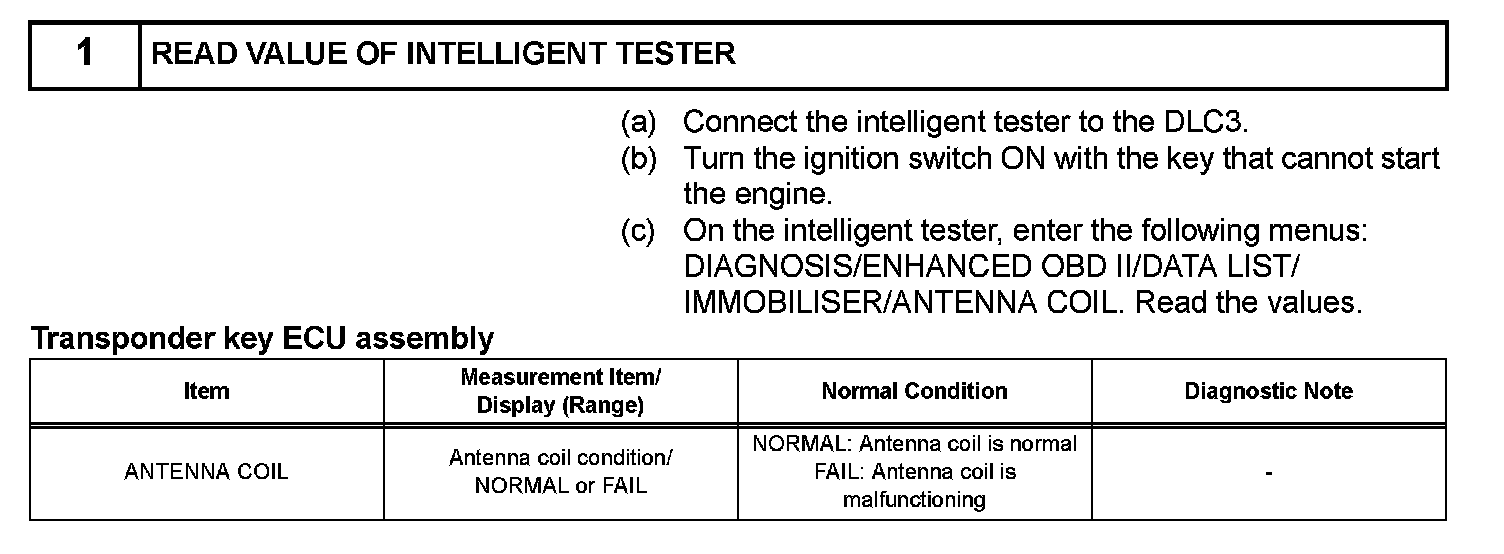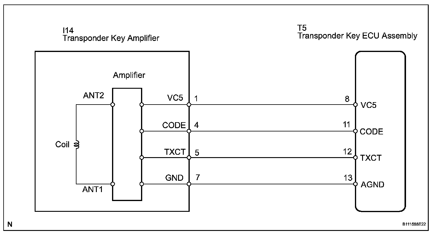 The transponder key coil receives key code signals from key's transponder chip. The coil is built into the transponder key amplifier, which amplifies the key code signals and output the signals to the transponder key ECU.