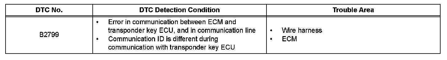This DTC is output when: 1) the ECM detects errors in its own communications with the transponder key ECU; 2) the ECM detects errors in the communication lines; and 3) the ECU communication ID between the transponder key ECU and the ECM are different and an engine start is attempted.