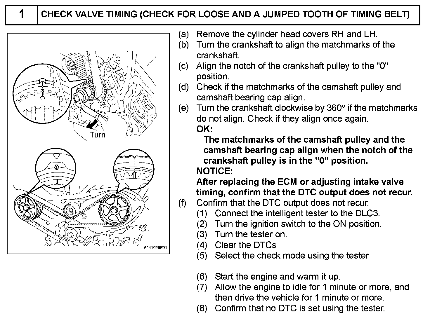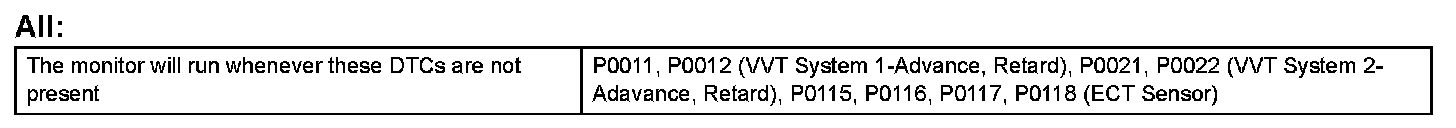 This DTC indicates that the intake camshaft has been installed toward the crankshaft at an incorrect angle, caused by factors such as the timing belt having jumped a tooth. This monitor begins to run after the engine has idled for 5 minutes.