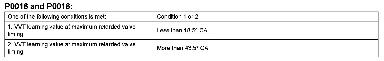 - The VVT learning value: Less than 18.5 °CA, or more than 43.5 °CA.