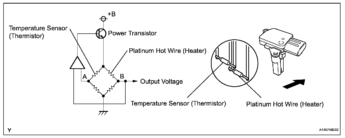 The Mass Air Flow (MAF) meter is a sensor that measures the amount of air flowing through the throttle valve. The ECM uses this information to determine the fuel injection time and to provide appropriate air-fuel ratio. Inside the MAF meter, there is a heated platinum wire which is exposed to the flow of intake air. By applying a specific electrical current to the wire, the ECM heats it to a specific temperature. The flow of incoming air cools both the wire and an internal thermistor, changing their resistance. To maintain a constant current value, the ECM varies the voltage applied to these components in the MAF meter. The voltage level is proportional to the air flow through the sensor, and the ECM uses it to calculate the intake air volume.