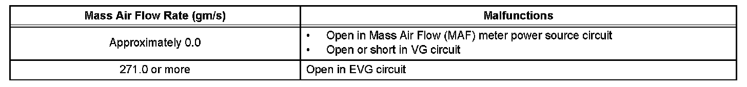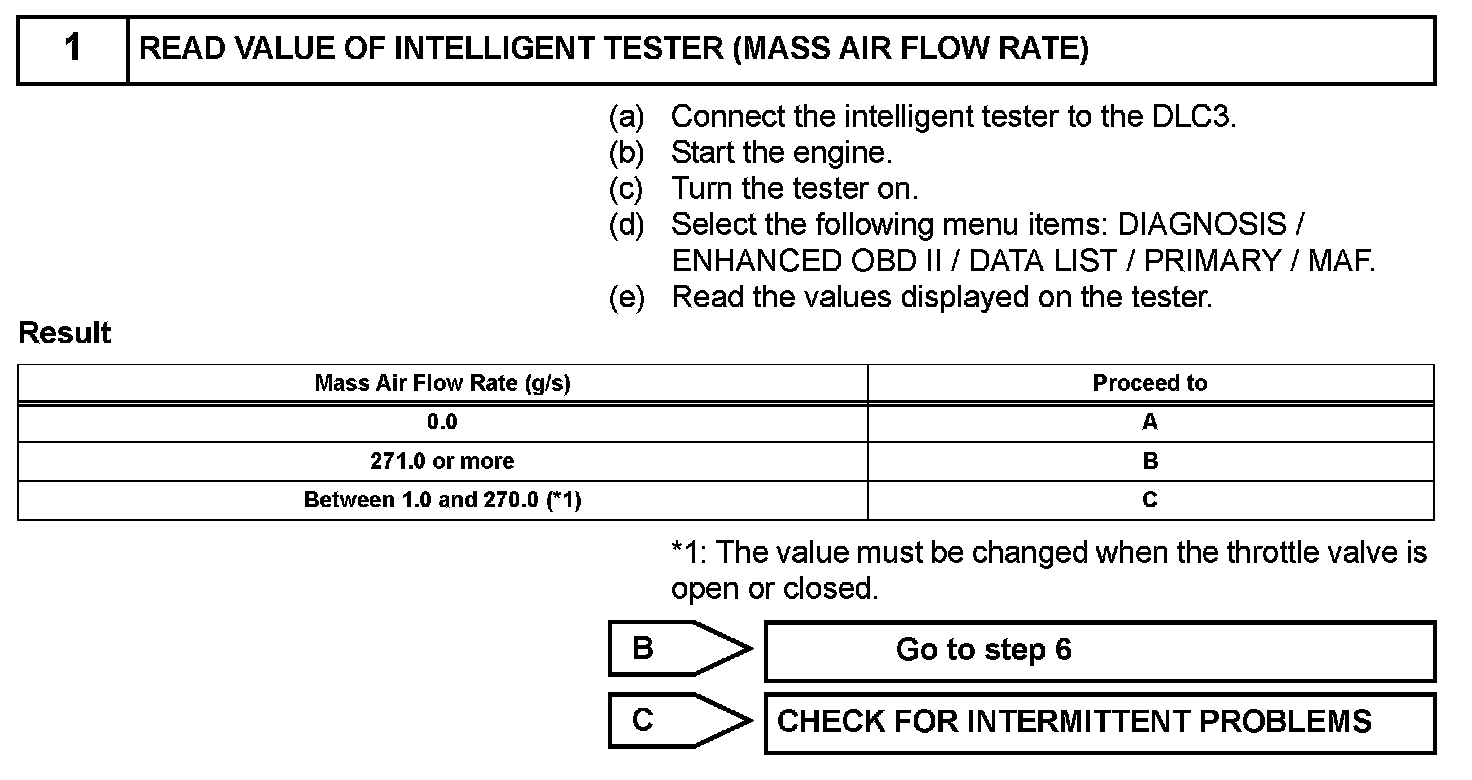 HINT: When any of these DTCs are set, check the air-flow rate by selecting the following menu items on an intelligent tester: DIAGNOSIS / ENHANCED OBD II / DATA LIST / PRIMARY / MAF.