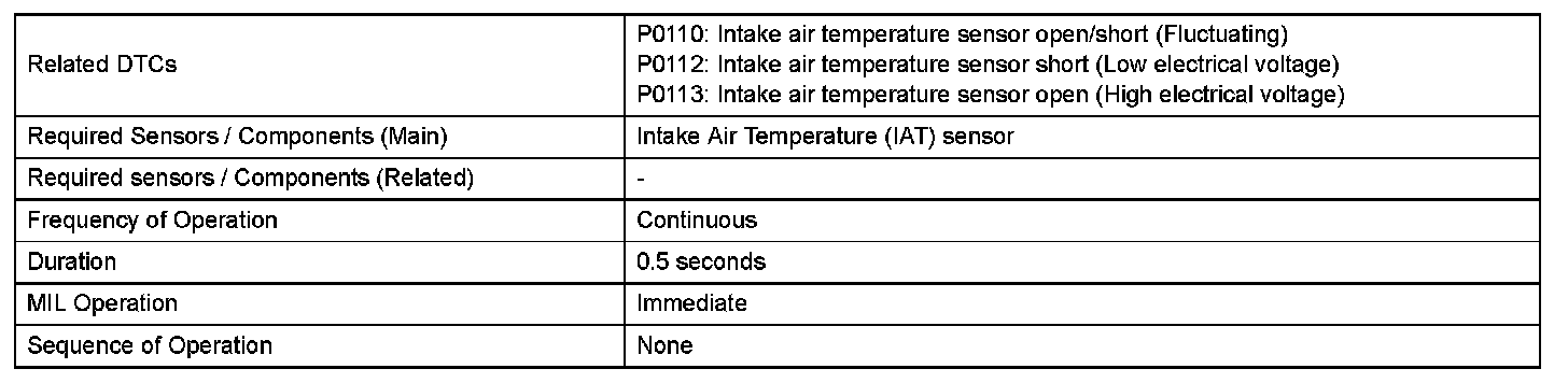 Example: If the sensor voltage output is -40 °C (-40 °F) for 0.5 seconds or more, the ECM determines that there is an open in the IAT sensor circuit, and sets DTC P0113. Conversely, if the voltage output is more than 140 °C (284 °F) for 0.5 seconds or more, the ECM determines that there is a short in the sensor circuit, and sets DTC P0112. If the malfunction is not repaired successfully, a DTC is set 0.5 seconds after the engine is next started.