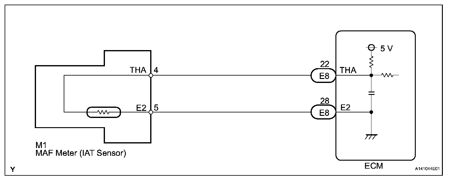 The IAT sensor is powered by a 5 V applied from the THA terminal of the ECM, via resistor R. Resistor R and the IAT sensor are connected in series. When the resistance value of the IAT sensor changes, according to changes in the IAT, the voltage at terminal THA also varies. Based on this signal, the ECM increases the fuel injection volume when the engine is cold to improve driveability.