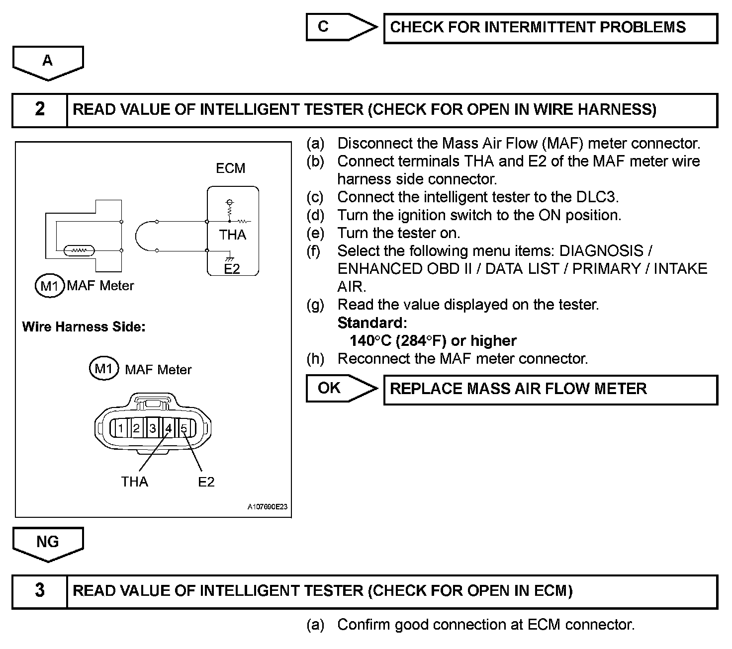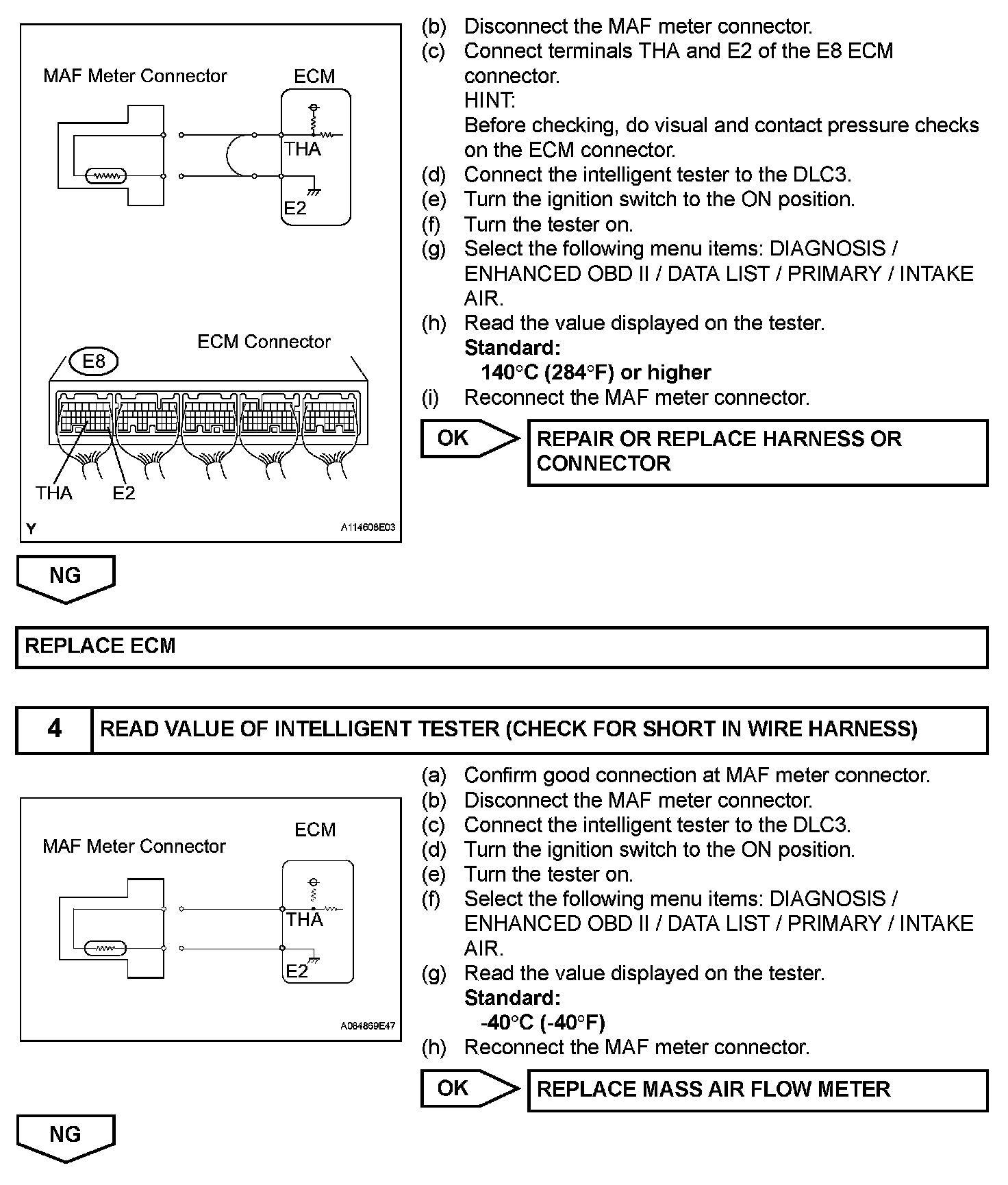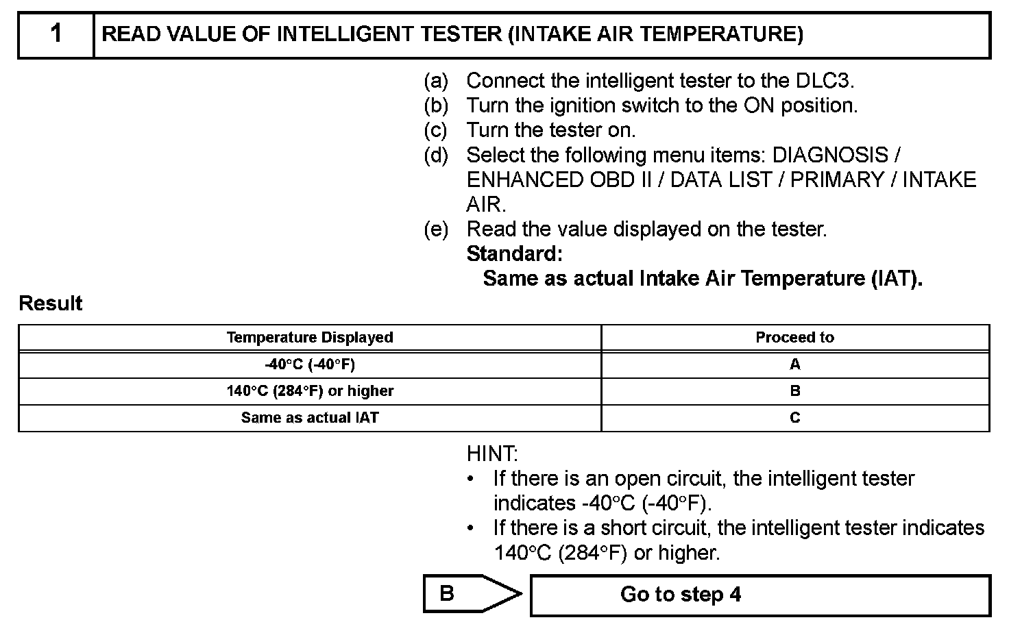 HINT: When any of these DTCs are set, check the IAT by selecting the following menu items on the intelligent tester: DIAGNOSIS / ENHANCED OBD II / DATA LIST / PRIMARY / INTAKE AIR.