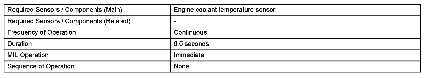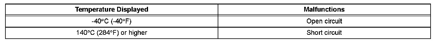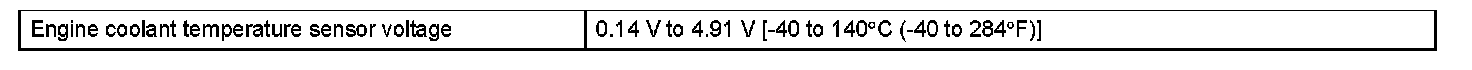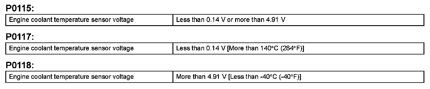 Example: If the sensor voltage output is -40 °C (-40 °F) for 0.5 seconds or more, the ECM determines that there is an open in the ECT sensor circuit, and sets DTC P0118. Conversely, if the voltage output is more than 140 °C (284 °F) for 0.5 seconds or more, the ECM determines that there is a short in the sensor circuit, and sets DTC P0117.