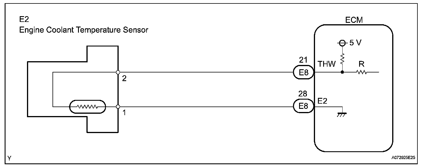 A thermistor is built into the Engine Coolant Temperature (ECT) sensor, of which the resistance value varies according to the ECT. The structure of the sensor and its connection to the ECM are the same as those of the Intake Air Temperature (IAT) sensor.