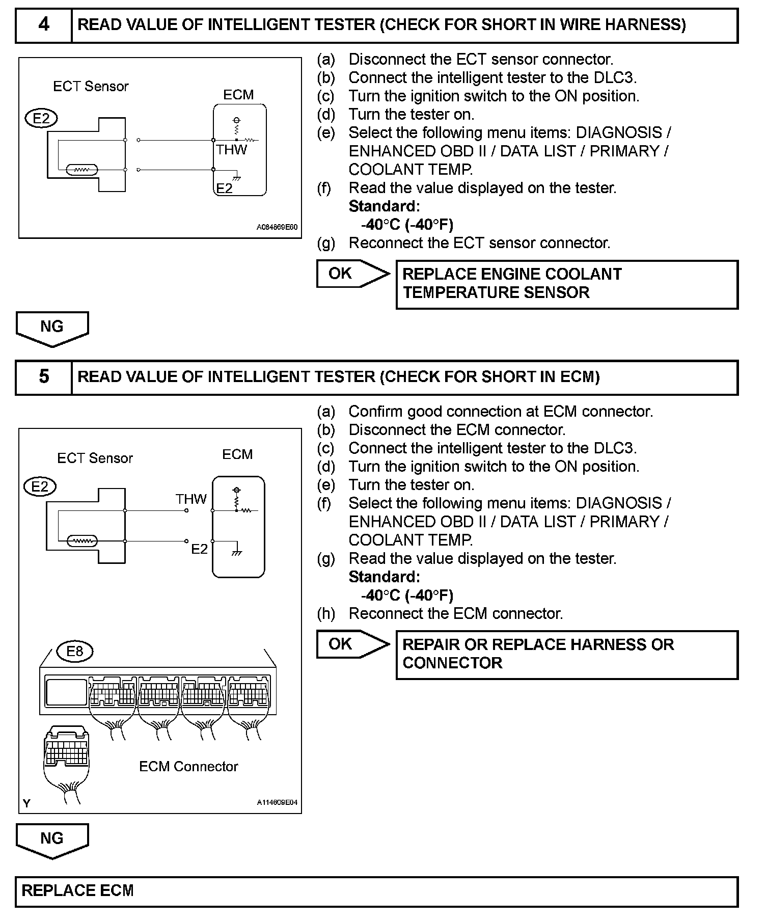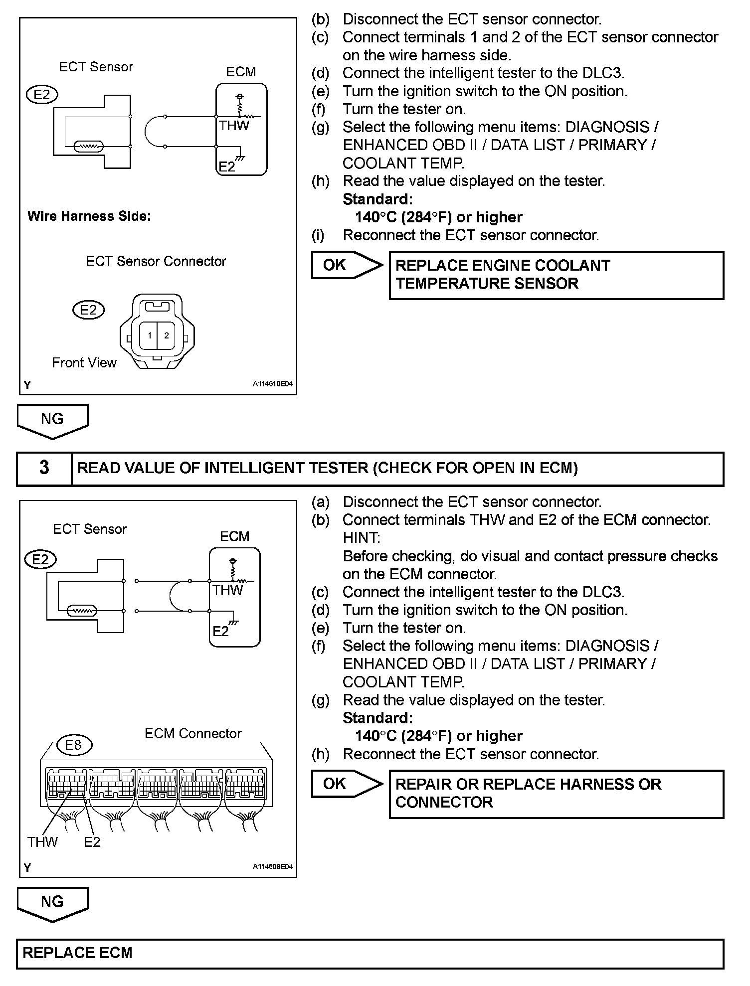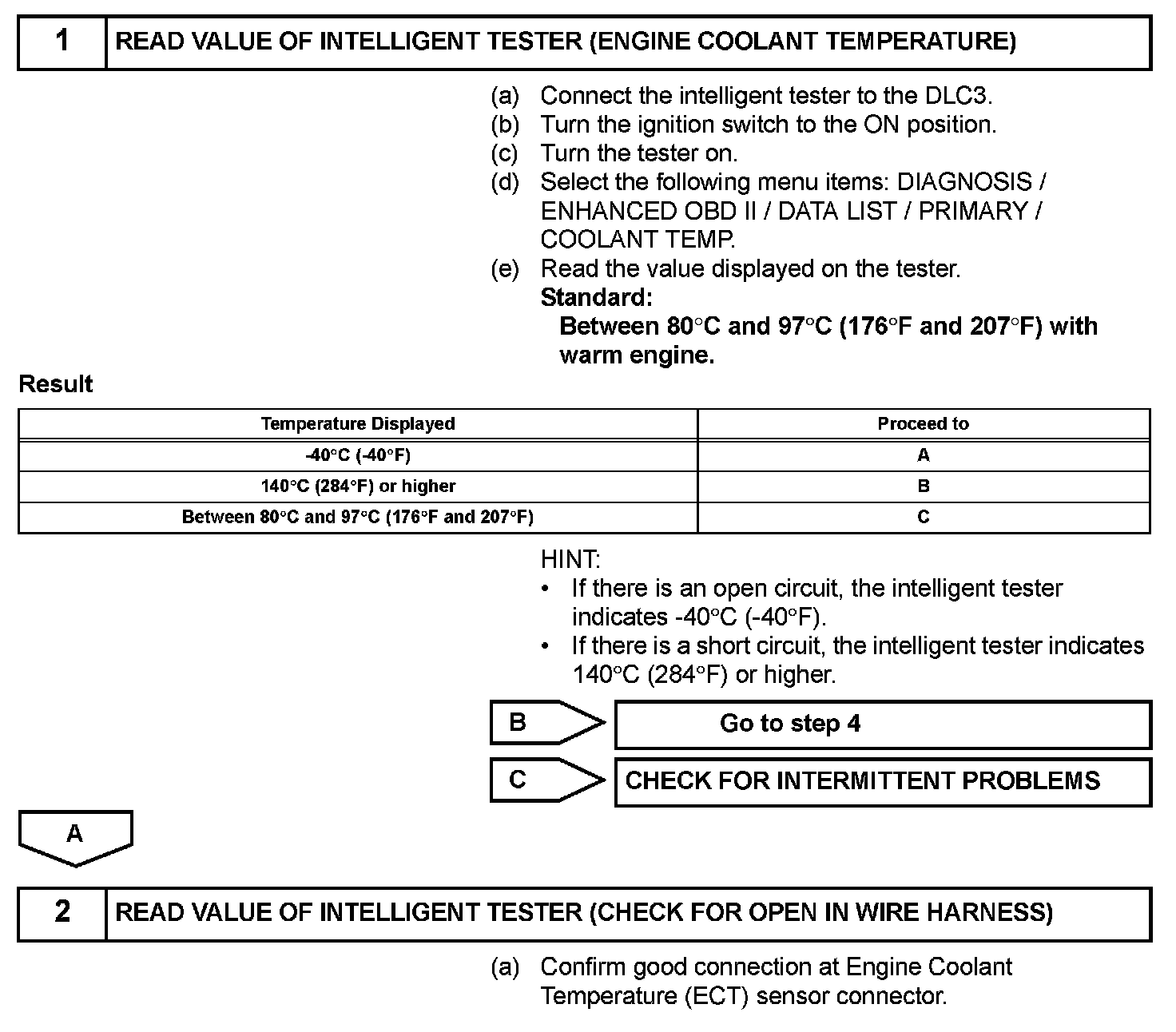 HINT: When any of these DTCs are set, check the ECT by selecting the following menu items on the intelligent tester: DIAGNOSIS / ENHANCED OBD II / DATA LIST / PRIMARY / COOLANT TEMP.