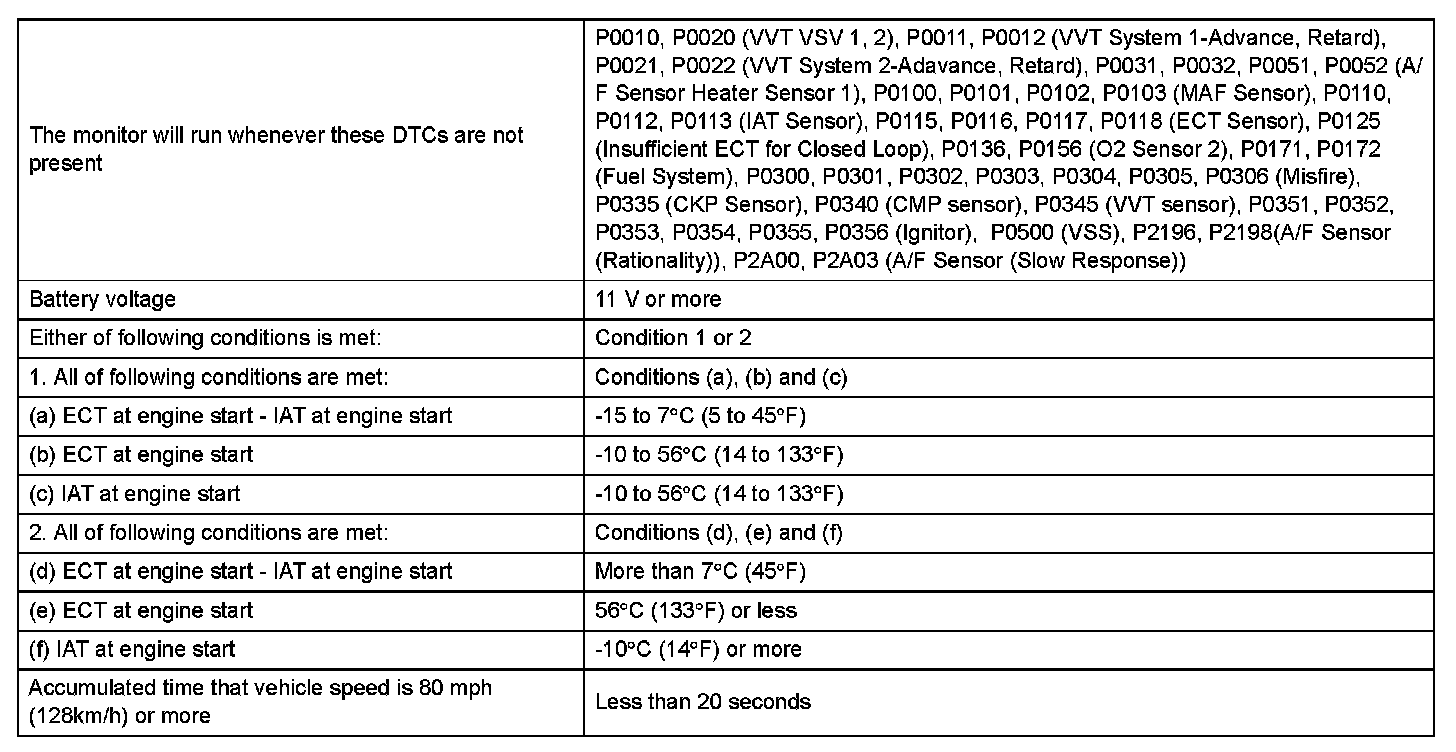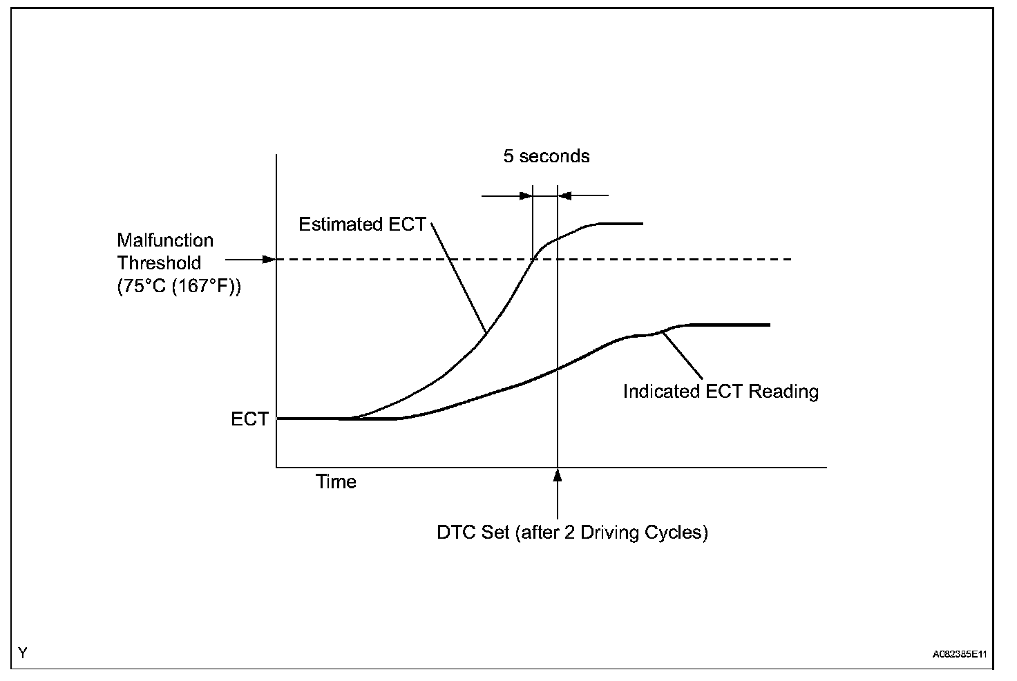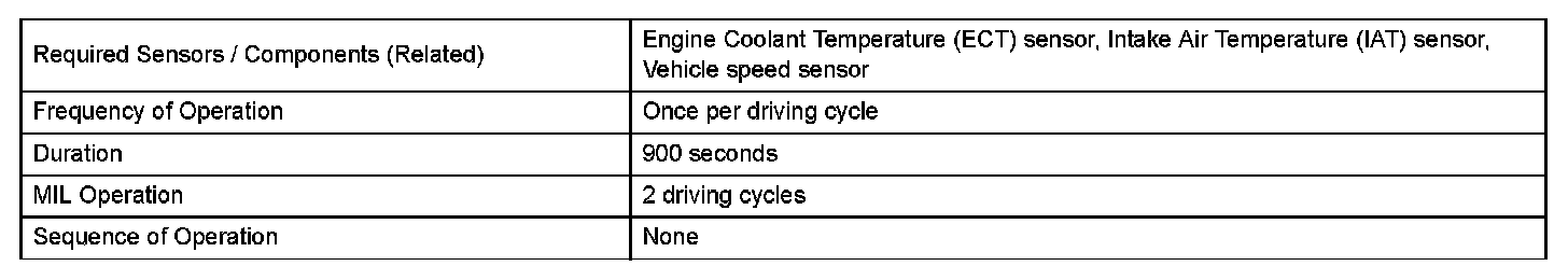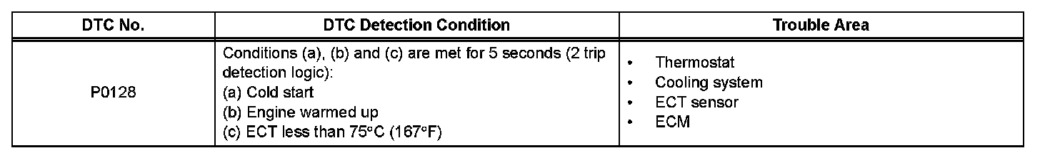 This DTC is set when the Engine Coolant Temperature (ECT) does not reach 75 °C (167 F) despite sufficient engine warm-up time.