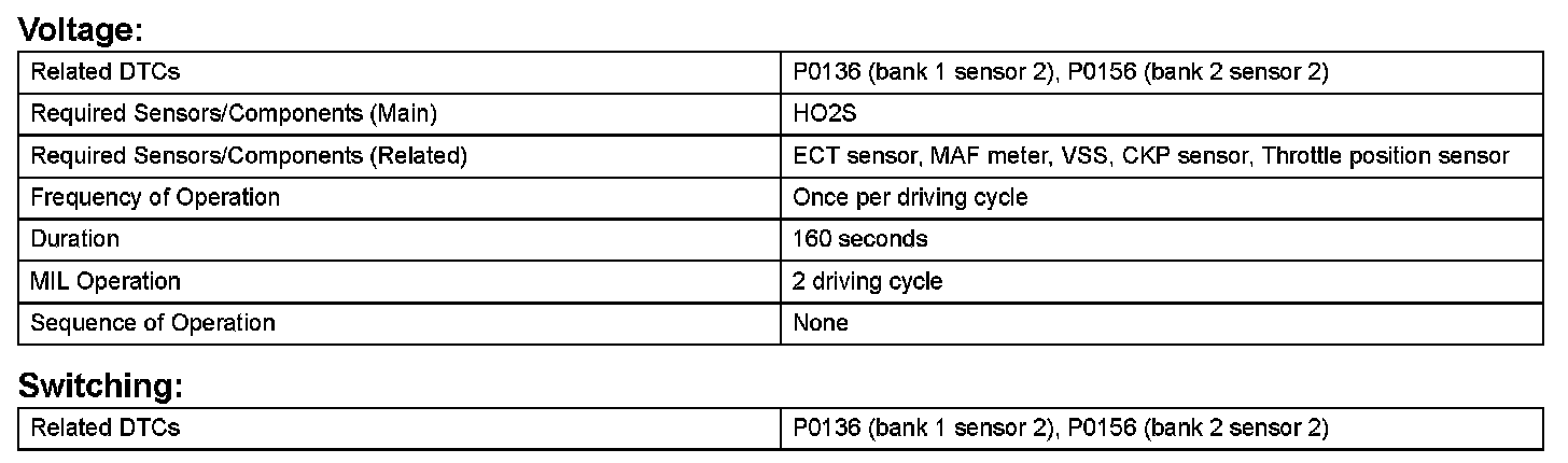 The ECM monitors the rear Heated Oxygen (HO2) sensor to check for the following malfunctions. If any of the malfunctions are detected, the ECM illuminates the MIL and sets a DTC.