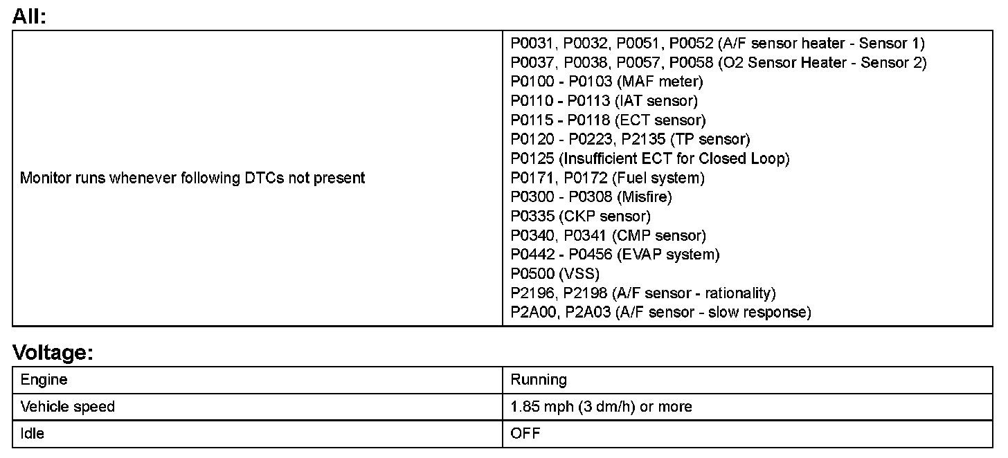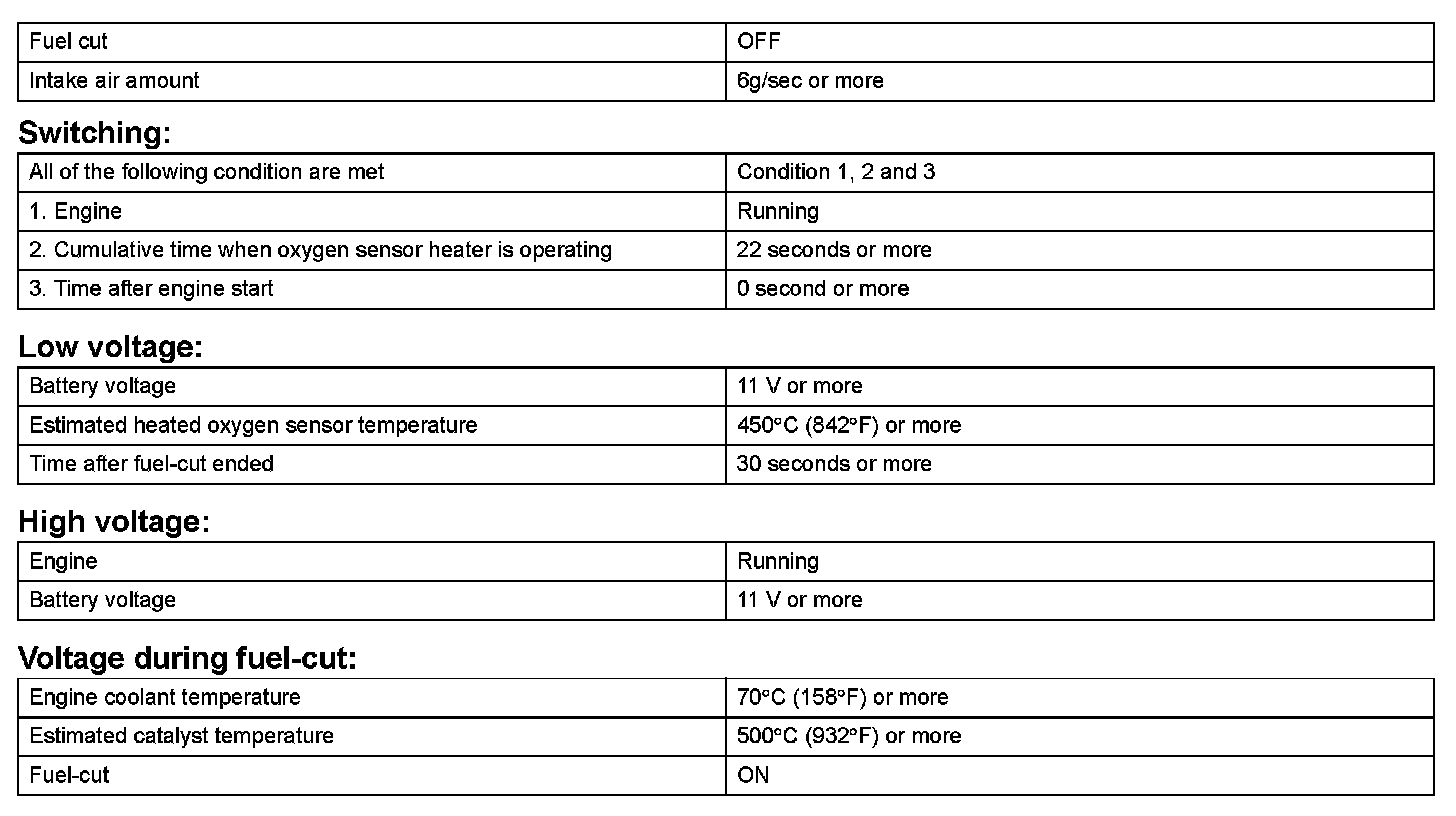 - The HO2 sensor output voltage remains at below 0.05 V, for a long period of time while the vehicle is driven.