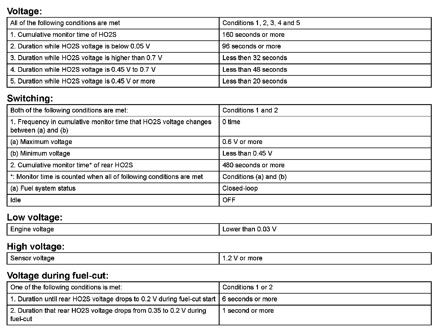 - The HO2 sensor output voltage remains above 0.45 V (rich) or below 0.45 V (lean) while the vehicle is accelerated and decelerated for 8 minutes.
