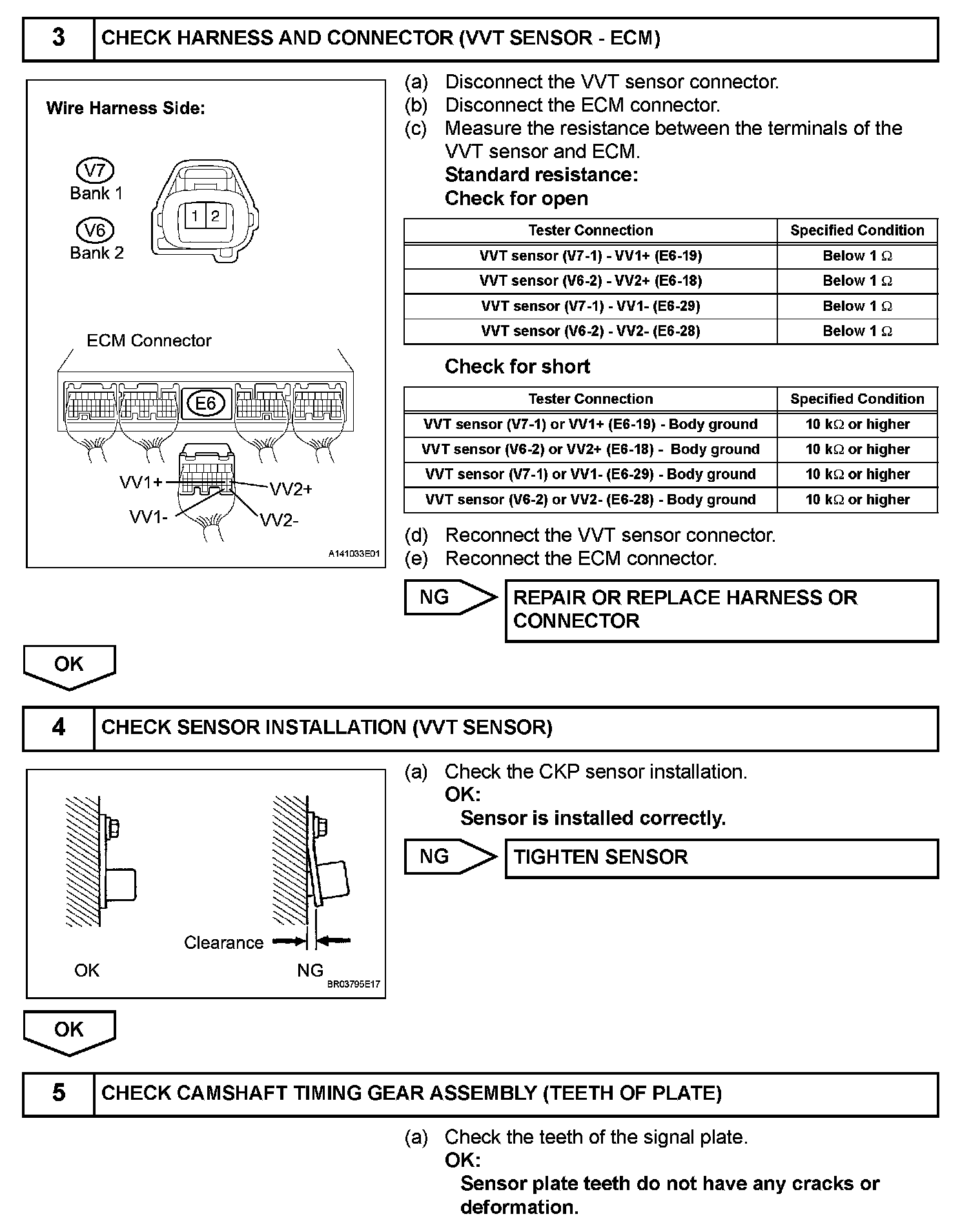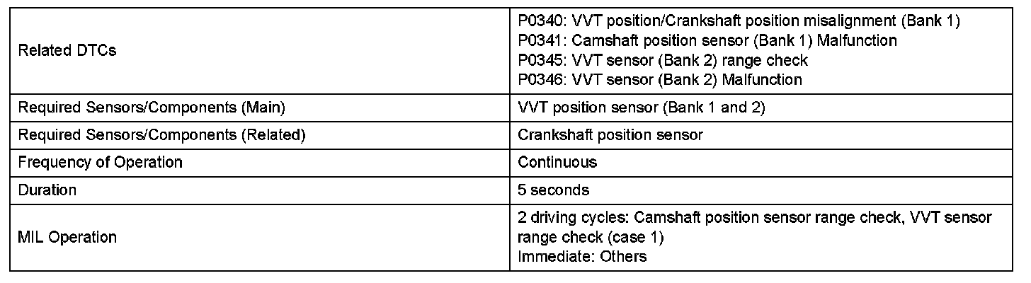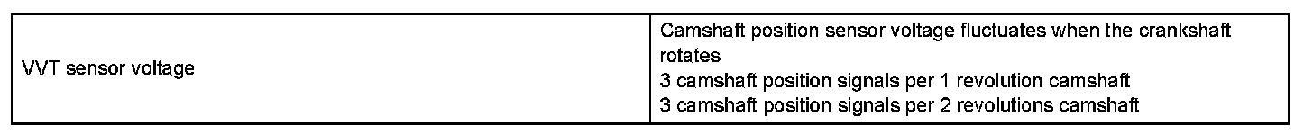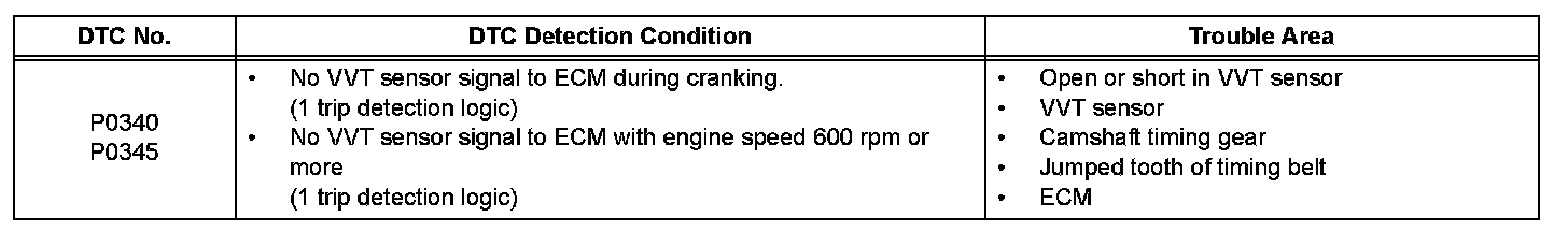 If no signal is transmitted by the VVT sensor despite the engine revolving, or the rotations of the camshaft and the crankshaft are not synchronized, the ECM interprets this as a malfunction of the sensor.