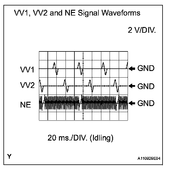 - VV1+ and VV2+ stand for the VVT sensor signal, and NE+ stands for the CKP sensor signal.