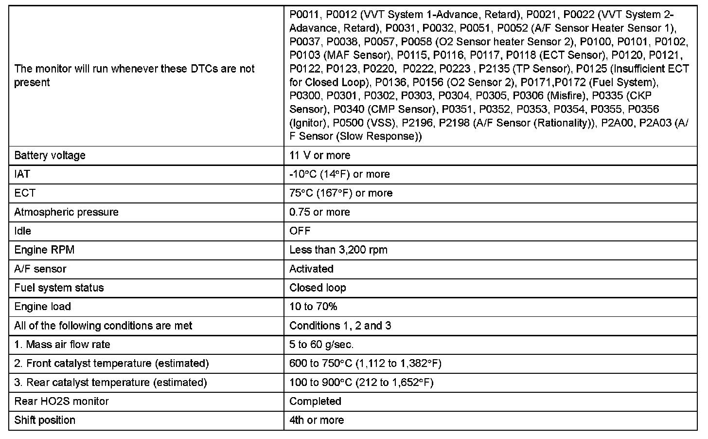 The ECM uses the sensors mounted in front of and behind the three-way catalyst (TWC) to monitor its efficiency. The first sensor, an Air Fuel ratio (A/F) sensor, sends pre- catalyst A/F ratio information to the ECM. The second sensor, a heated oxygen sensor (O2S), sends post-catalyst information to the ECM. The ECM compares these 2 signals to judge the efficiency of the catalyst and the catalyst's ability to store oxygen. During normal operation, the TWC stores and releases oxygen as needed. The capacity to store oxygen results in a low variation in the post-TWC exhaust stream.
