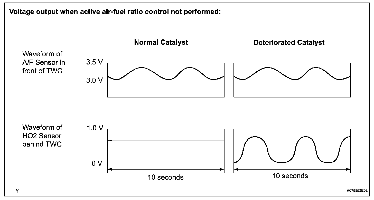 - If the Three-Way Catalytic Converter (TWC) has deteriorated, the HO2 sensor (located behind the TWC) voltage output fluctuates up and down frequently, even under normal driving conditions (active air-fuel ratio control is not performed).